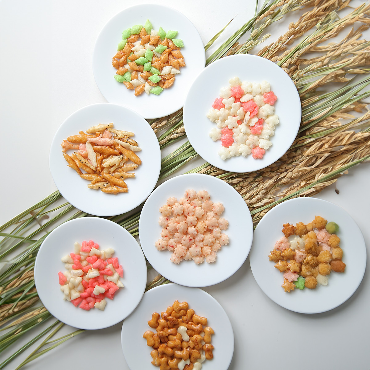<あゆ>餅米(国内産)、醤油、水飴、食塩、砂糖、胡麻、アーモンド、海老、海苔、食用油脂/酒精、調味料(アミノ酸等)、着色料(紅麹、カラメル、黄4、黄5、赤40、赤102)、乳化剤、(一部に小麦・えび・大豆・ごま・アーモンドを含む)