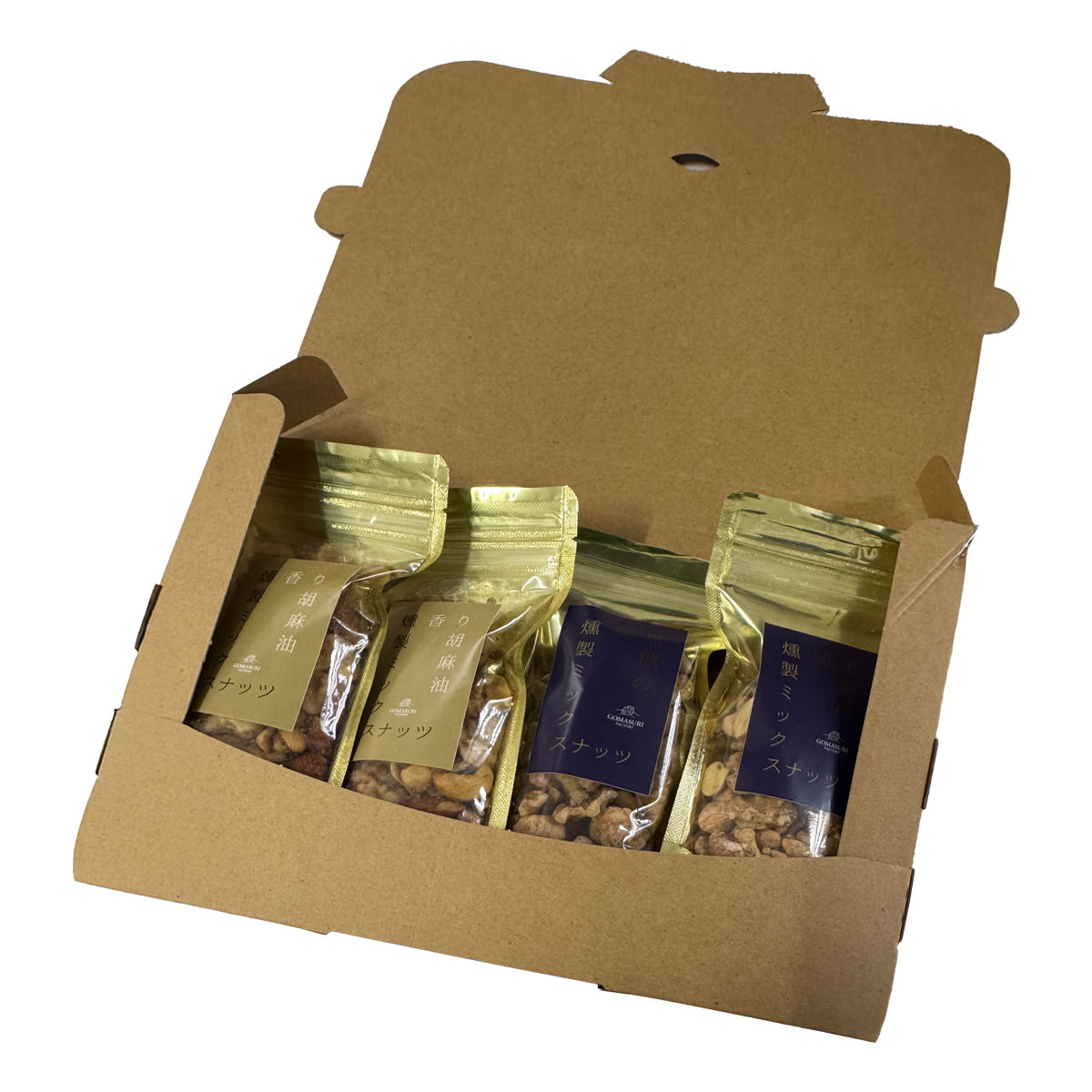 鹿児島のごますりファクトリーがお届けする「喜界島 燻製ミックスナッツ 詰め合わせ」です。おつまみ、おやつ、お茶請けなどにおすすめです。<香り胡麻油 燻製ミックスナッツ>国内流通シェアが少ない、稀少な国産ごま(喜界島産)から作られた「高級胡麻油」と、喜界島産「海塩」を贅沢に使った燻製ミックスナッツ。芳醇な喜界島産ごま油の香りと、燻製された4種類のナッツが様々な味わいをみせる贅沢なおつまみ。<純黒糖の燻製ミックスナッツ>鹿児島県喜界島の農家さんが大切に育てたサトウキビから作られた、稀少な純黒糖をたっぷり使った燻製ミックスナッツ。口の中に含んだ瞬間に広がる優しい甘さの純黒糖と、燻製されたナッツの相性がぴったりの逸品。ごますりファクトリーが手がけるクラフトビール「WAN50」や黒糖焼酎、ウイスキーなどのお酒とも好相性。お好みのアルコール飲料とのペアリングをお楽しみください。