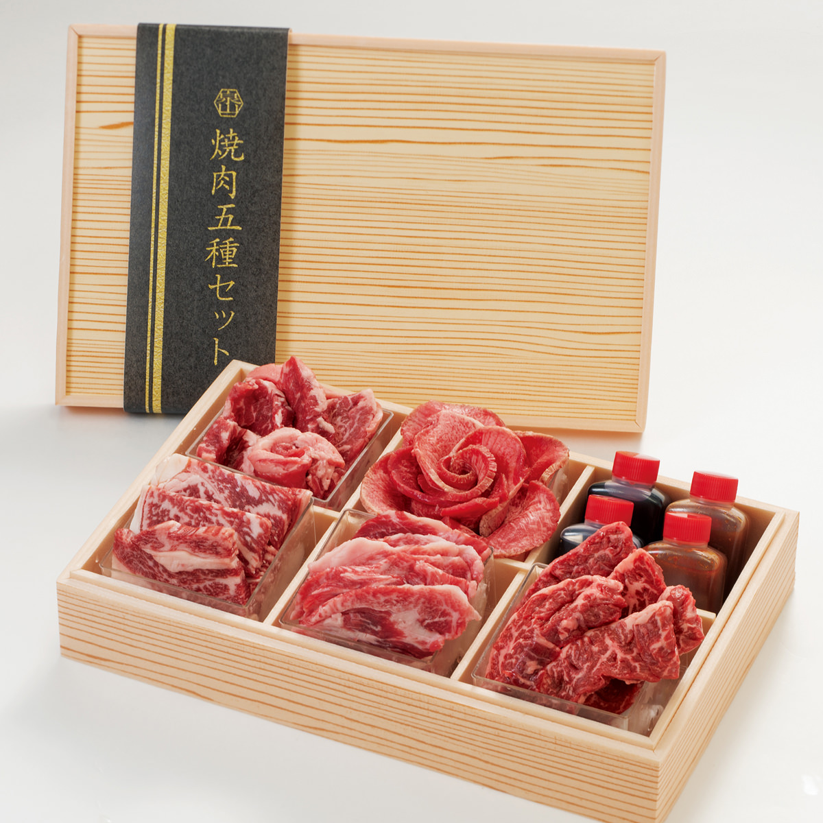 ●原材料:<焼肉5種>カルビ(米国産)、ハラミ(米国産又は豪州産)、上たん(米国産)、中落カルビ(国産)、和牛ロース(国産)、(一部に牛肉を含む)