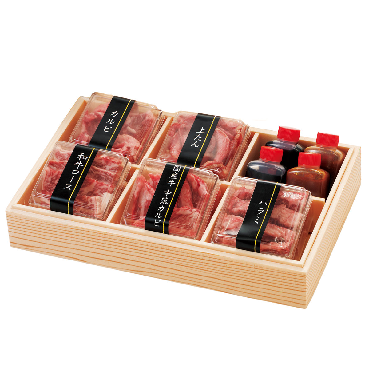 ●数量・内容:(和牛ロース、国産牛中落カルビ、ハラミ、カルビ、上たん) 各100g×1、(もみだれ、つけだれ) 各30g×2