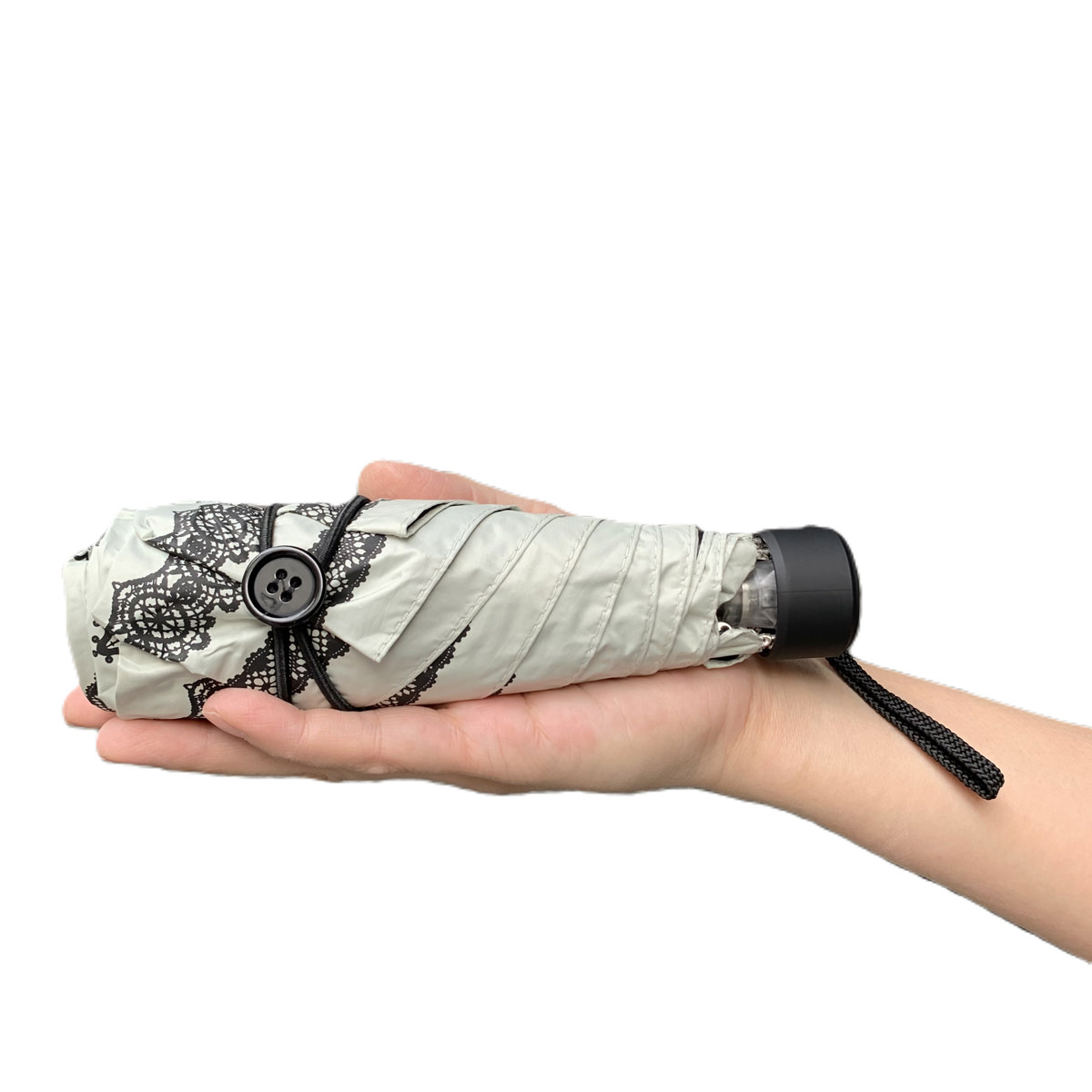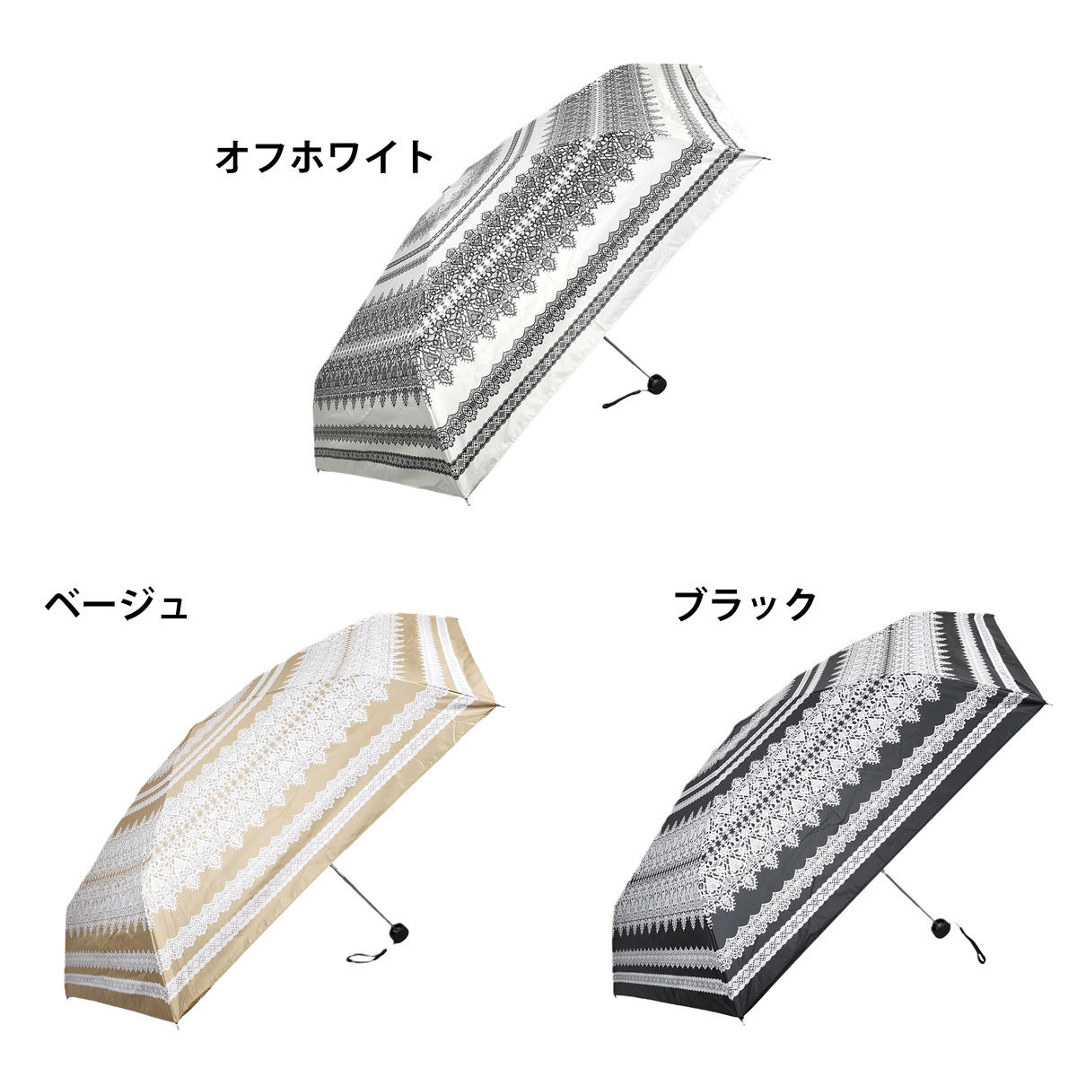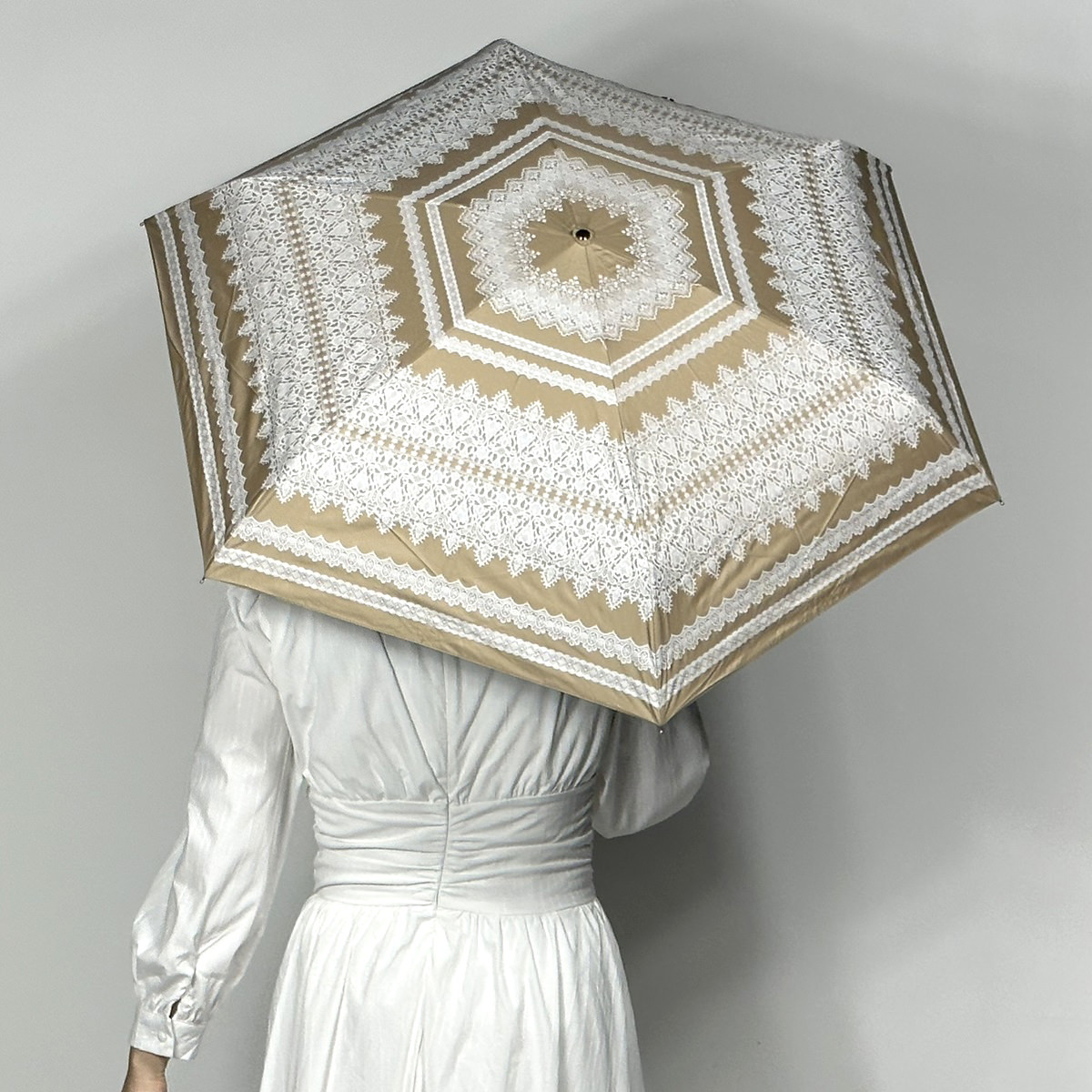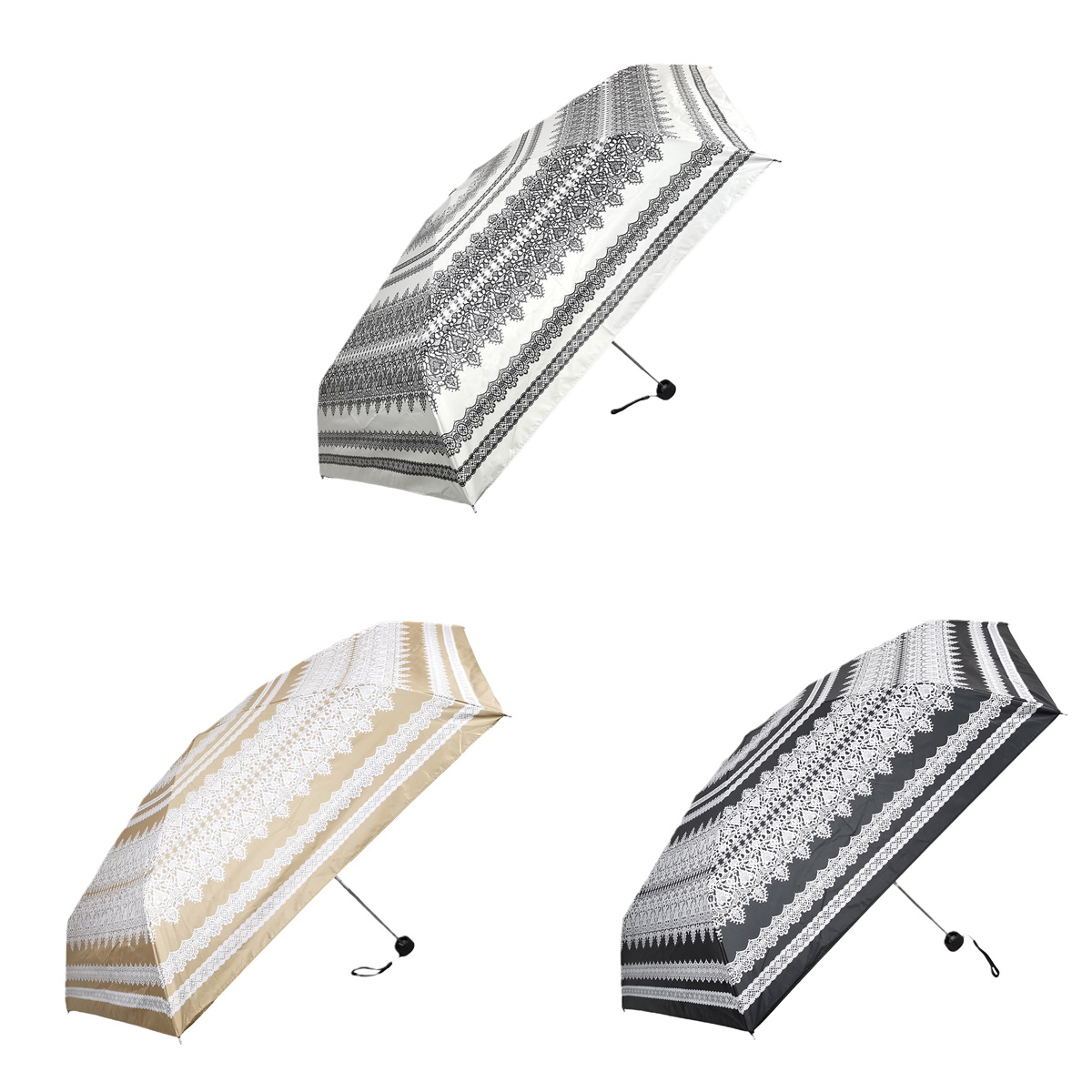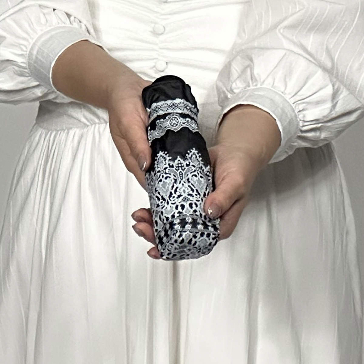 「折りたたみ傘 晴雨兼用 スギタ レース柄 極小18cm」は、傘の老舗メーカー”スギタ(SUGITA)”が開発した、コンパクトな折りたたみ傘です。畳んだ状態の長さは18cmほどの手のひらサイズ。細さ約3mmのステンレス中棒の採用により実現した極小傘です。ポケットや小さなポシェットにスッポリ入るので、携帯電話を持つように、いつでもどこにでも持ち運べます。広げた大きさは約90cmあり、雨や日差しから体をガードできます。UVカット99.9%、遮光99.99%、遮熱約20℃、耐水圧10000mmのスペックを誇り、雨傘だけでなく、日傘として使うことも可能です。ゴム製の簡単傘収納リングが付いており、人込みの中や時間のないときでも、素早くゴムでパッとまとめられます。カラーは、オフホワイト、ベージュ、ブラックからお選びいただけます。