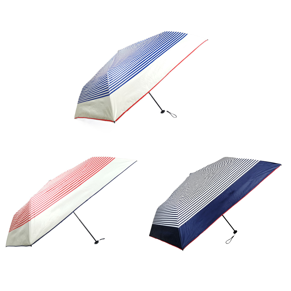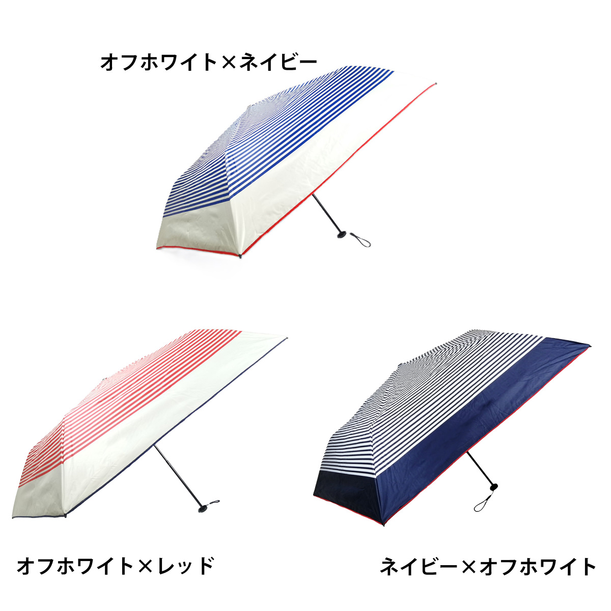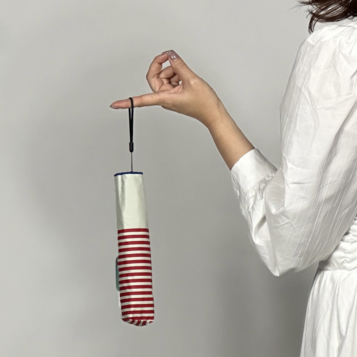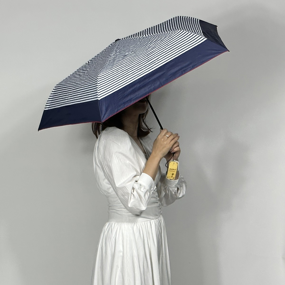 「折りたたみ傘 晴雨兼用 マリンボーダー極軽120g カーボン」は、傘の老舗メーカー”スギタ(SUGITA)”が開発した、コンパクトな折りたたみ傘です。畳んだ状態の長さは約22cmの手のひらサイズ。女性用の小さなポシェットやクラッチバックにもすっぽり入ります。重さは約120gと軽量で、持ち運びしやすいのが魅力です。中骨を極軽カーボンにすることで、軽さを実現できました。持った時に思わず「軽いっ!」と言ってしまうほど軽量な晴雨兼用傘です。UVカット99.9%、遮光99.99%、遮熱約20℃、耐水圧10000mmのスペックを誇り、雨傘だけでなく、日傘として使うことも可能です。カラーは、オフホワイト×ネイビー、オフホワイト×レッド、ネイビー×オフホワイトからお選びいただけます。