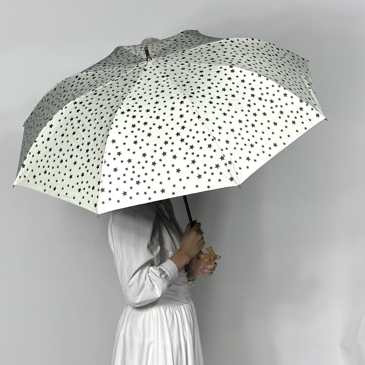 「ショートワイド傘 晴雨兼用 スギタ 星柄」は、傘の老舗メーカー”スギタ(SUGITA)”が開発した、コンパクトな傘です。長傘は持ち運びに邪魔、折りたたみ傘は畳むのが面倒な上、差したときに小さくて濡れる、といったお悩み、不便さを解消しました。畳むとトートバッグに入るコンパクトなサイズ。広げると直径約97cm、UVカット99.9%、遮光99.99%、遮熱約20℃、耐水圧10000mmと機能的で、雨からも日差しからも体をガードできます。カラーはオフホワイト、ピンク、ネイビーから選べます。環境省の海洋プラスチックごみ問題の解決に取り組むキャンペーン(2018年~)「Plastics Smart(プラスチックスマート)」の事例として紹介されています。ANA「WonderFLY(ワンダーフライ)」【旅の常識を覆すモノ】クリエイティブアワードを受賞(2016年)。