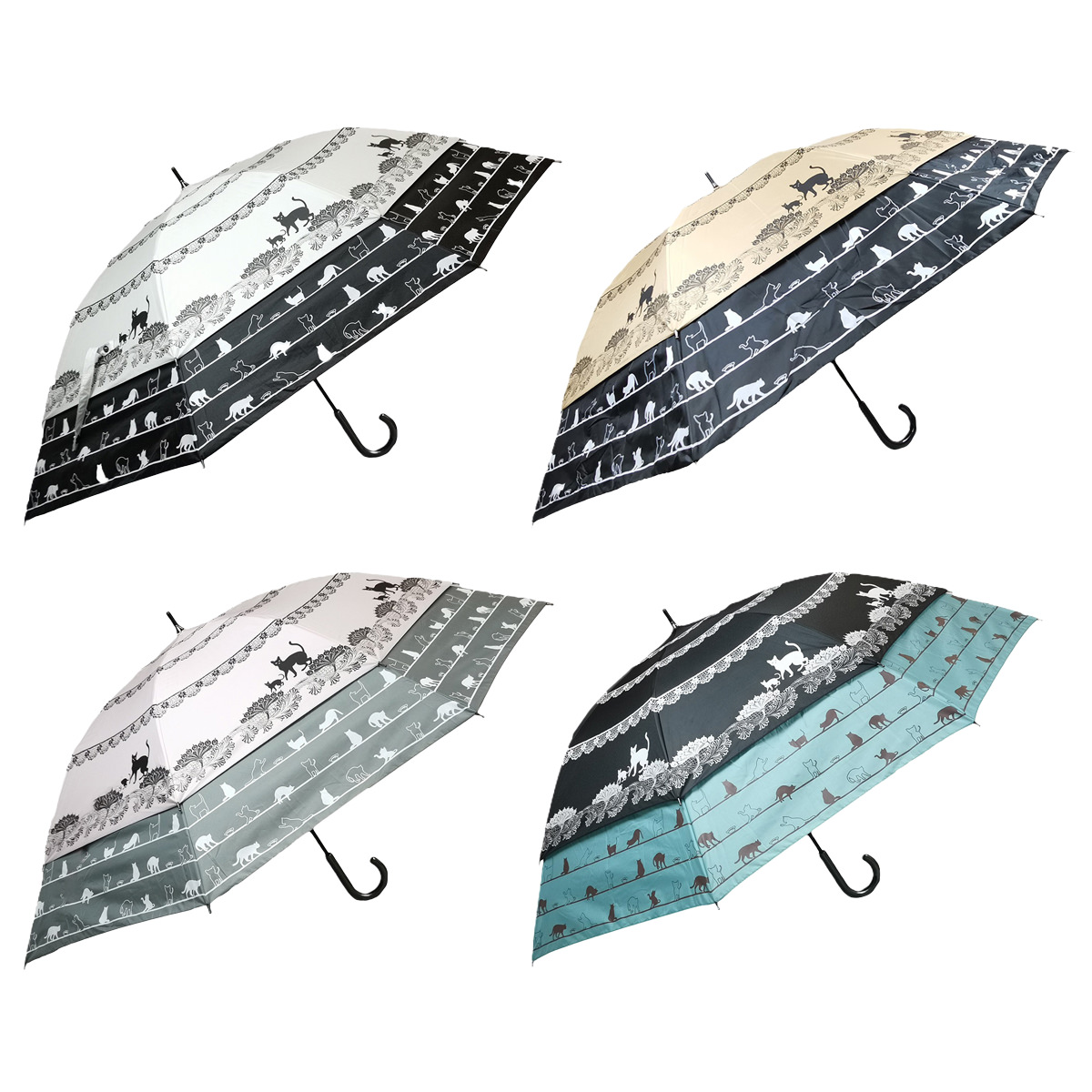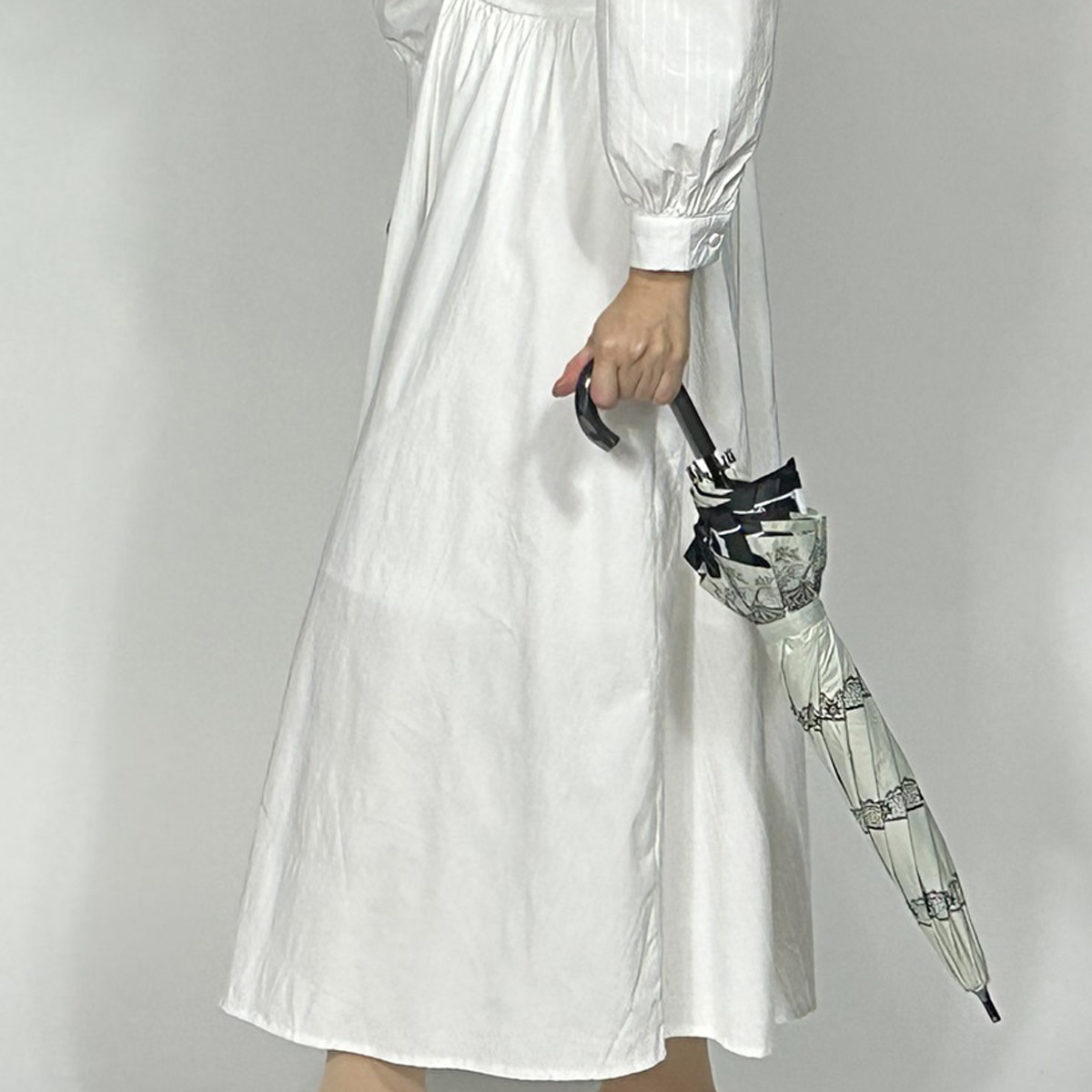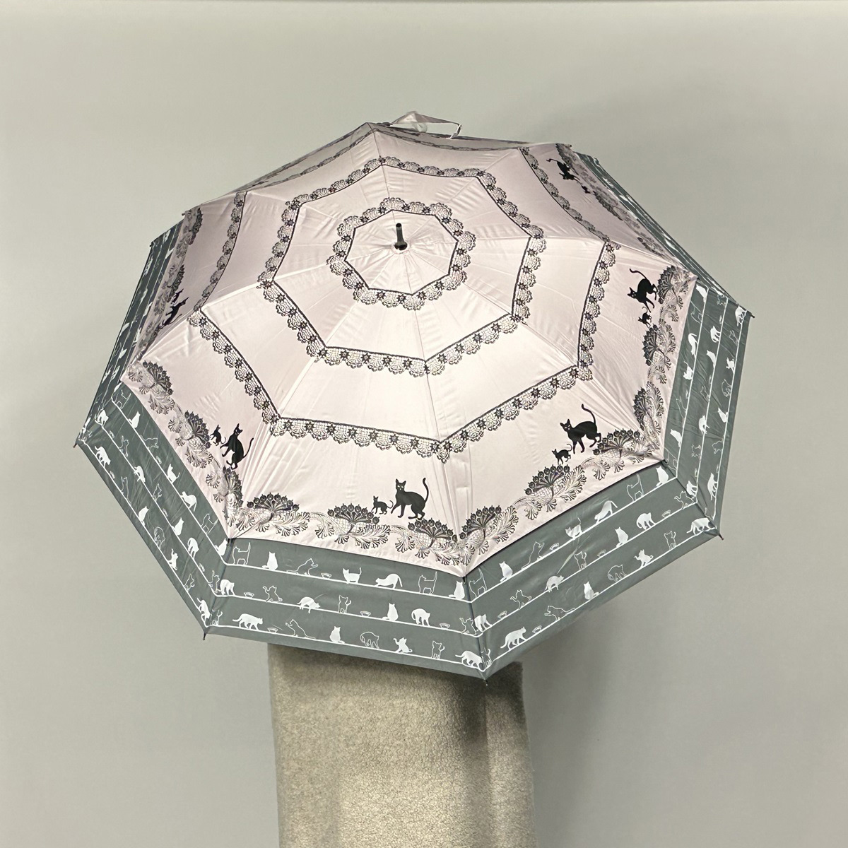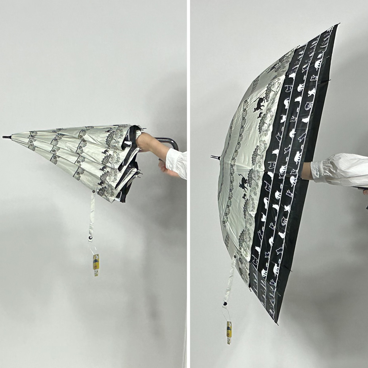 「トランスフォーム傘 晴雨兼用 熱中症対策 レース&猫」は傘の老舗メーカー”スギタ(SUGITA)”が開発した傘です。長傘は持ち運びに邪魔、折りたたみ傘は畳むのが面倒で差したときに小さくて濡れる、といったお悩み、不便さを解消しました。畳むと子供傘サイズになり、持ち運びに便利。床に擦れることもありません。閉じた状態では親骨45cmですが、開くと親骨60cmの大きい傘に変身。本体生地はUVカット99.9%、遮光99.99%、遮熱約20℃、耐水圧10000mmのスペックを誇り、雨や日差しから体をガードできます。風や熱が抜ける構造で、耐風性に優れている上、熱中症対策にも役立ちます。カラーはオフホワイト、ベージュ、ピンク、ブラックから選べます。環境省の海洋プラスチックごみ問題の解決に取り組むキャンペーン「Plastics Smart(プラスチックスマート)」の事例として紹介されています。