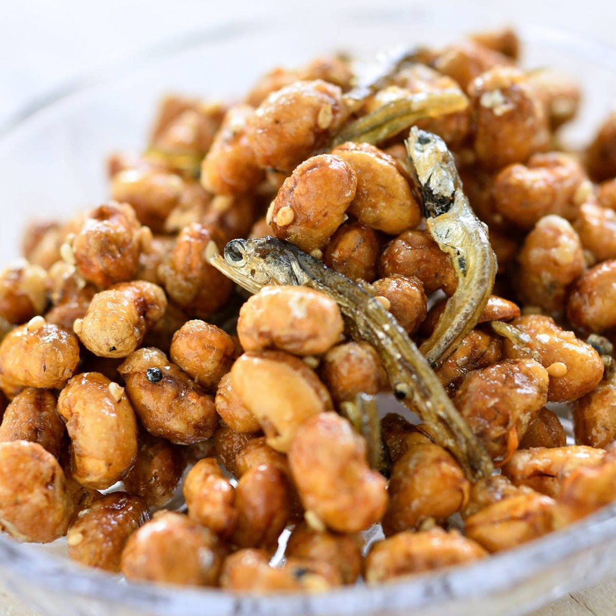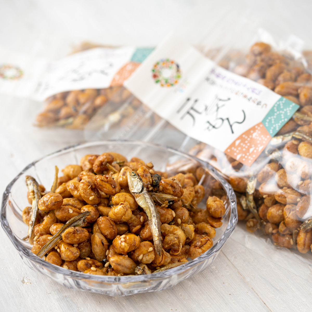 ●原材料:大豆(愛媛県宇和島市産)、かえりちりめん、三温糖、こいくち醤油、片栗粉、みりん、ごま、圧搾なたね油(遺伝子組換えでない)、圧搾金白胡麻油、(一部に大豆・小麦・ごまを含む)