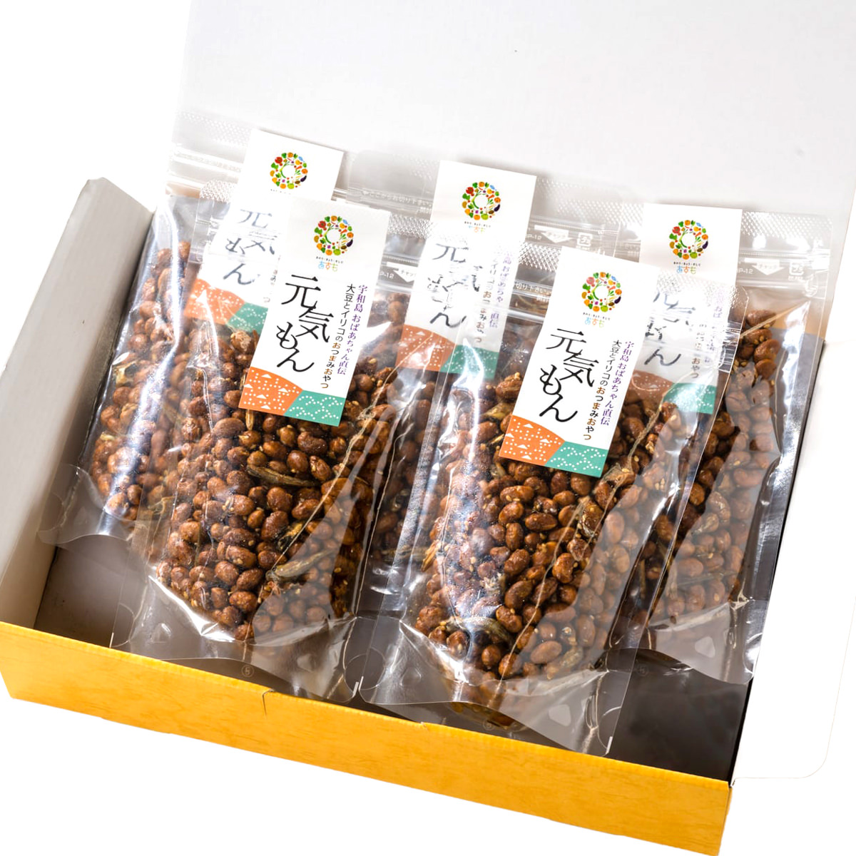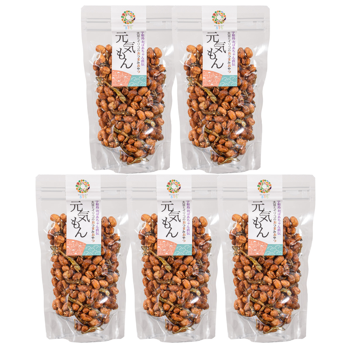 「宇和島 津島あぐり工房 大豆といりこのおつまみ 元気もん」は、愛媛県産の大豆といりこをカラッと揚げ、砂糖と醤油を絡めたカルシウム豊富なおつまみおやつです。大豆を使用しているのに固くなく、食べやすいので、おやつ、おつまみ、お酒のお供などにぴったり。手軽にイソフラボンを摂取したい方にもおすすめです。油で揚げているのに軽い食感。地場産の大豆を使い、調味料から揚げ油にまでこだわり、無添加で仕上げています。砂糖と醤油で絡めているのにべとつかず、手につきません。ジッパー付のパッケージのため、開け閉めが簡単。保管や携帯もしやすく、手軽にカバンに入れて持ち歩けます。