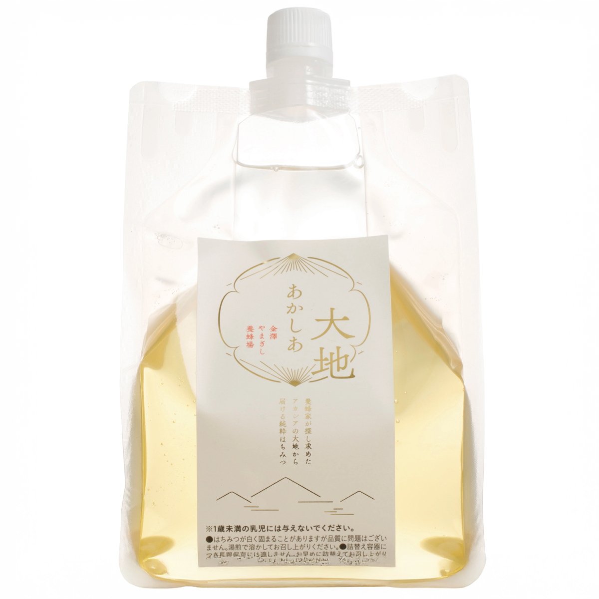 石川県金沢市の金澤やまぎし養蜂場がお届けする非加熱・生アカシアはちみつ「あかしあ大地」です。金澤やまぎし養蜂場の「あかしあ大地」はクセのない透明感のある甘みとフレッシュな風味が特徴です。トーストに塗ったり、紅茶に入れたり、料理の隠し味にもおすすめです。砂糖やみりん代わりに使うと、お料理にコクや照りをプラスできます。あっさりとクセのない味なので、毎日お使いいただけます。黄金色のひとさじが毎日の食卓をより豊かにしてくれます。詰め替えしやすいエコパック入り。コンパクトに捨てられます。スタンドパックなので収納・保管の際も便利。「あかしあ大地」の原産地は、見渡す限りアカシア林が続き、聞こえるのはミツバチの羽音だけという自然豊かな黄河流域にあります。現地で厳密なチェックを行い、品質基準を満たしたはちみつだけを使用。香りや風味を損なわないよう、採れたての美味しさを保つために丁寧に詰めています。※1歳未満の乳児には与えないでください。