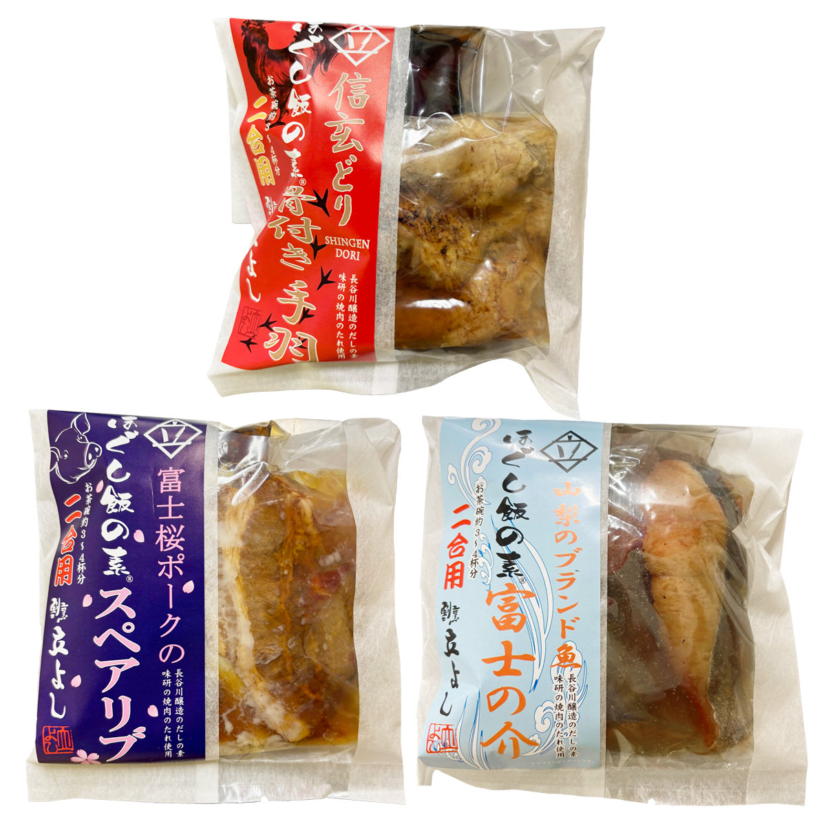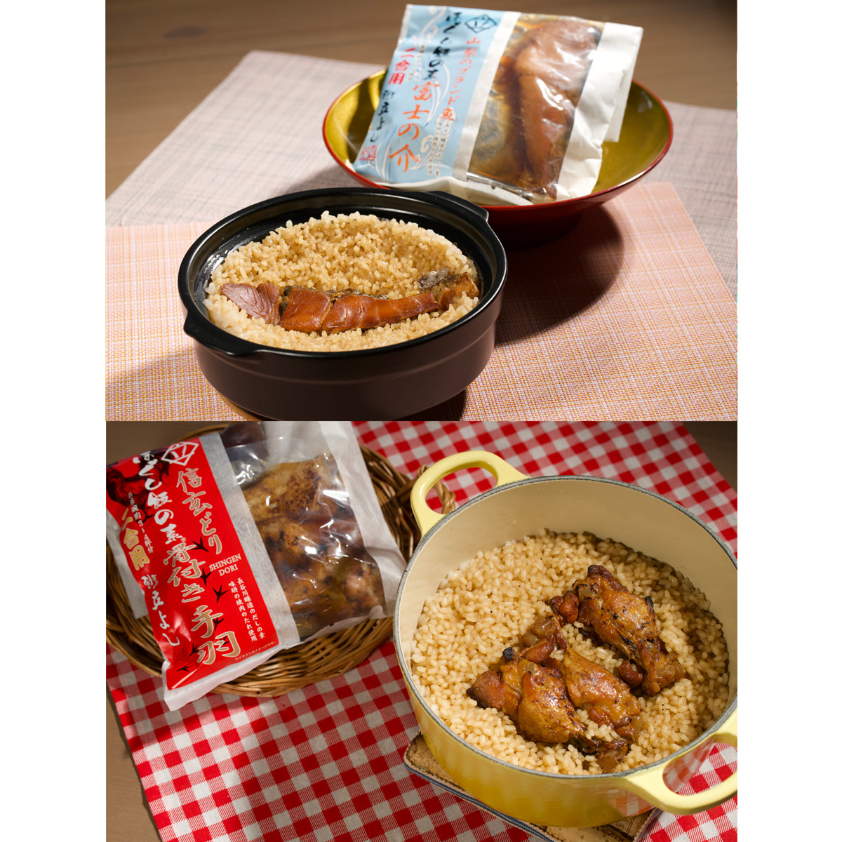 創業25年創業、山梨県富士川町の老舗割烹旅館「立よし」が手間隙掛けて作る「割烹立よし ほぐし飯の素 食べ比べセット」です。研いだお米に具材と出汁を入れて炊くだけで手軽に割烹の味が楽しめます。※「ほぐし飯の素」は、柳澤弘征が保有する登録商標です。(商標登録第6472227号)<信玄どり骨付き手羽>山梨のブランド鶏「信玄どり」を使用。板前が一本一本丁寧に直火で炙った骨付き手羽元は香ばしく、肉離れも良いです。長谷川醸造のだしの素と味研の焼肉のたれを使った出汁はやみつきになる味わい。<富士桜ポークのスペアリブ>山梨県のブランド豚肉「富士桜ポーク」のロース肉を使用。豊かなボリューム、適度な霜降り、ジューシーな口当たり、柔らかくきめの細かい独自の食感が特徴。<富士の介>「キングサーモン」と「ニジマス」を交配した山梨オリジナルのブランド魚「富士の介(ふじのすけ)」を使用。ジューシーな味わい。{調理方法}2合のお米を研ぎ、ザルで水を切る。付属の出汁を注ぎ、具を載せて炊飯。炊き上がったらしゃもじでほぐしてお召し上がりください。