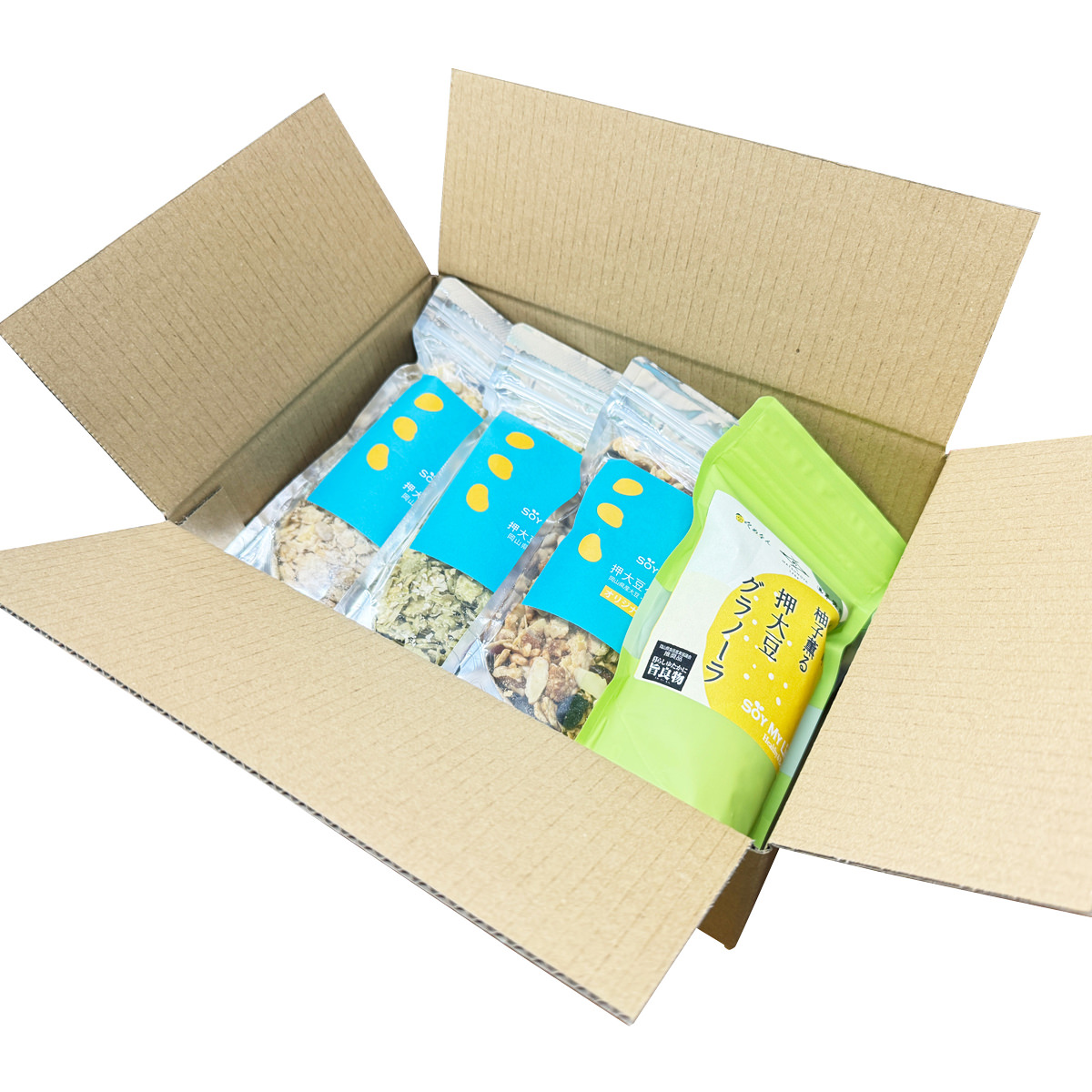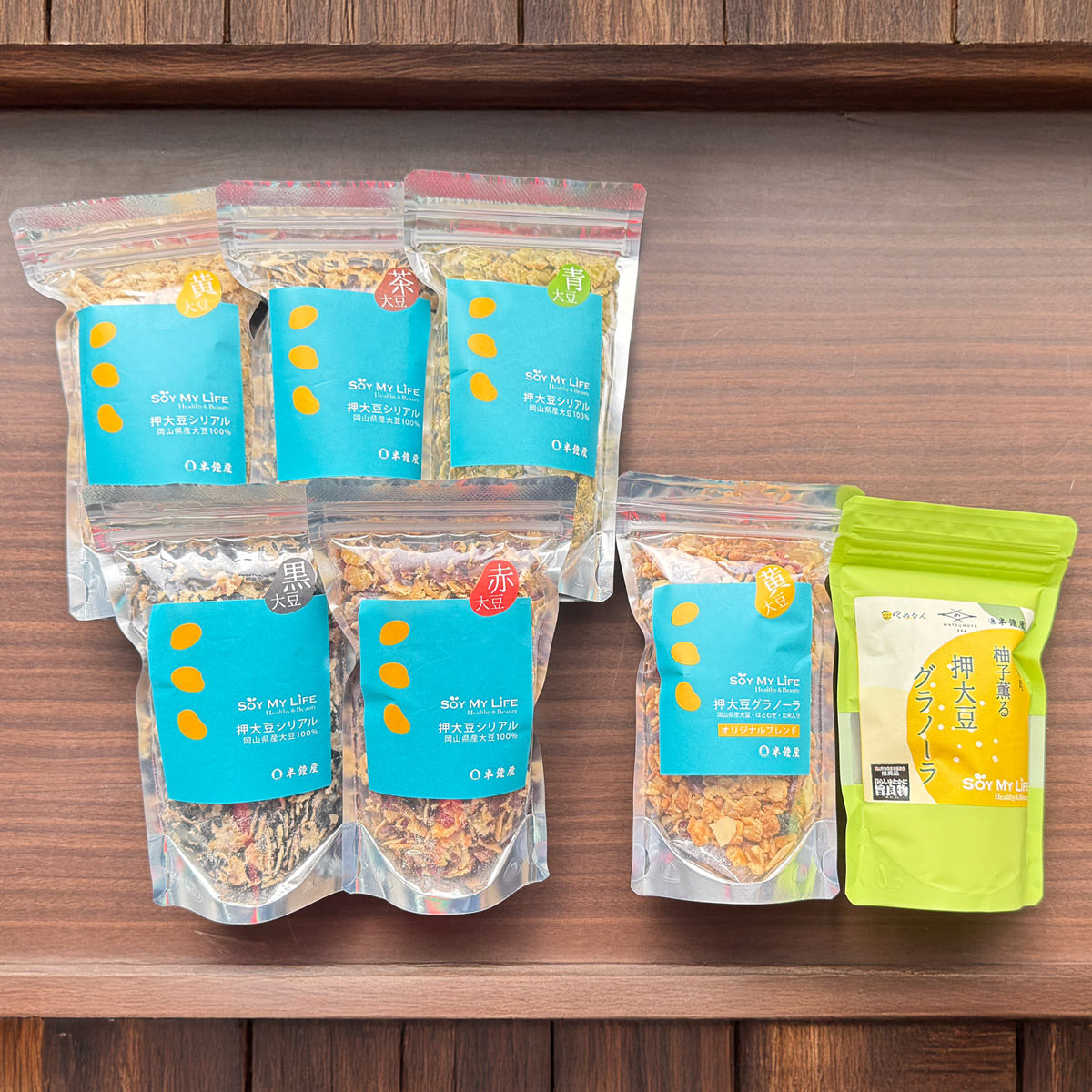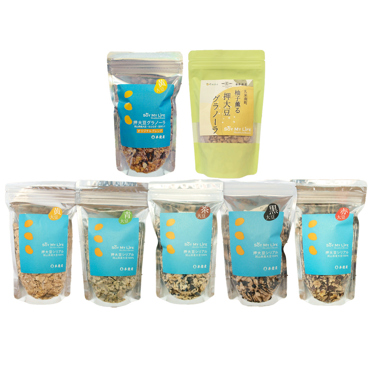 ●数量・内容:押大豆シリアル(黄、青、茶、黒、赤) 各150g、押大豆グラノーラ(オリジナルブレンド)150g、久米南町柚子薫る押大豆グラノーラ120g