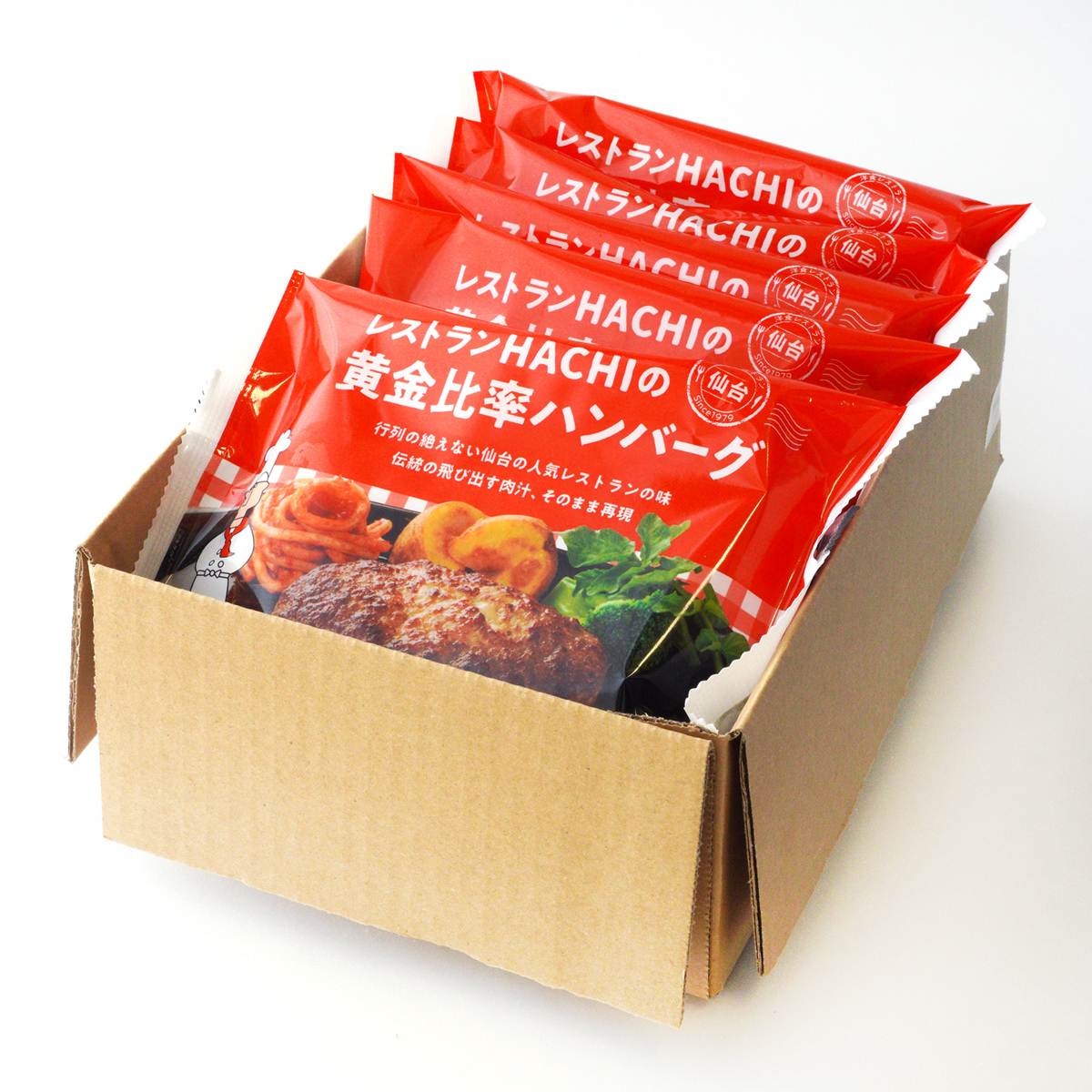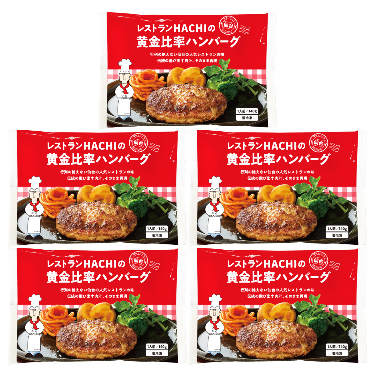 宮城県仙台市の洋食レストランの味を手軽に楽しめる「仙台 レストランHACHIの黄金比率ハンバーグ」です。肉汁が飛び出すレストランHACHIの黄金比率ハンバーグ。牛肉7、豚肉3、たっぷりの卵と独特のスパイスは、1979年の創業から受け継がれるレシピです。パテに穴が空いているのが特徴で、ご家庭のフライパンで簡単に焼いてお召し上がりいただけます。ソースレスタイプなので、お好みのソースでお召し上がりください。デミグラスソースのほか、ポン酢と大根おろし、わさび醤油、岩塩などもおすすめです。全国からナポリタンを集めた実食イベント「カゴメ ナポリタンスタジアム(2013年)」において、「黄金比率のハンバーグ」を使用した「黄金比率のハンバーグのせ赤ナポリタン」がグランプリに輝きました。{調理方法}冷蔵庫で完全に解凍する。温めたフライパンに穴のあいた面を下にして並べ、フタをして弱火~中火で焼く。裏返して再度フタをして焼く。火を止め、フタをしたまま1分間余熱で仕上げをする。