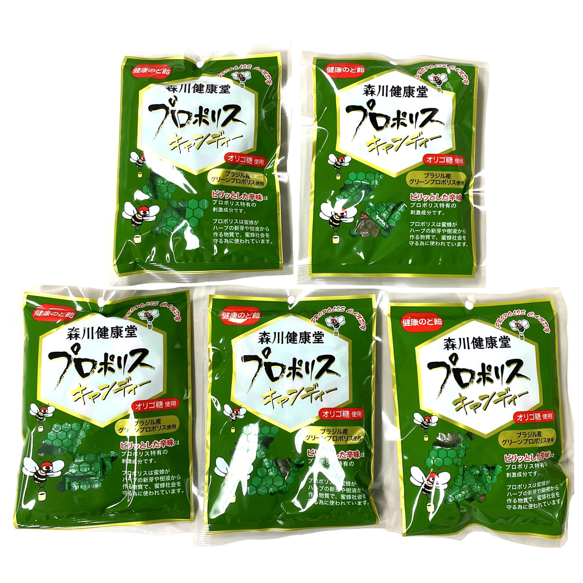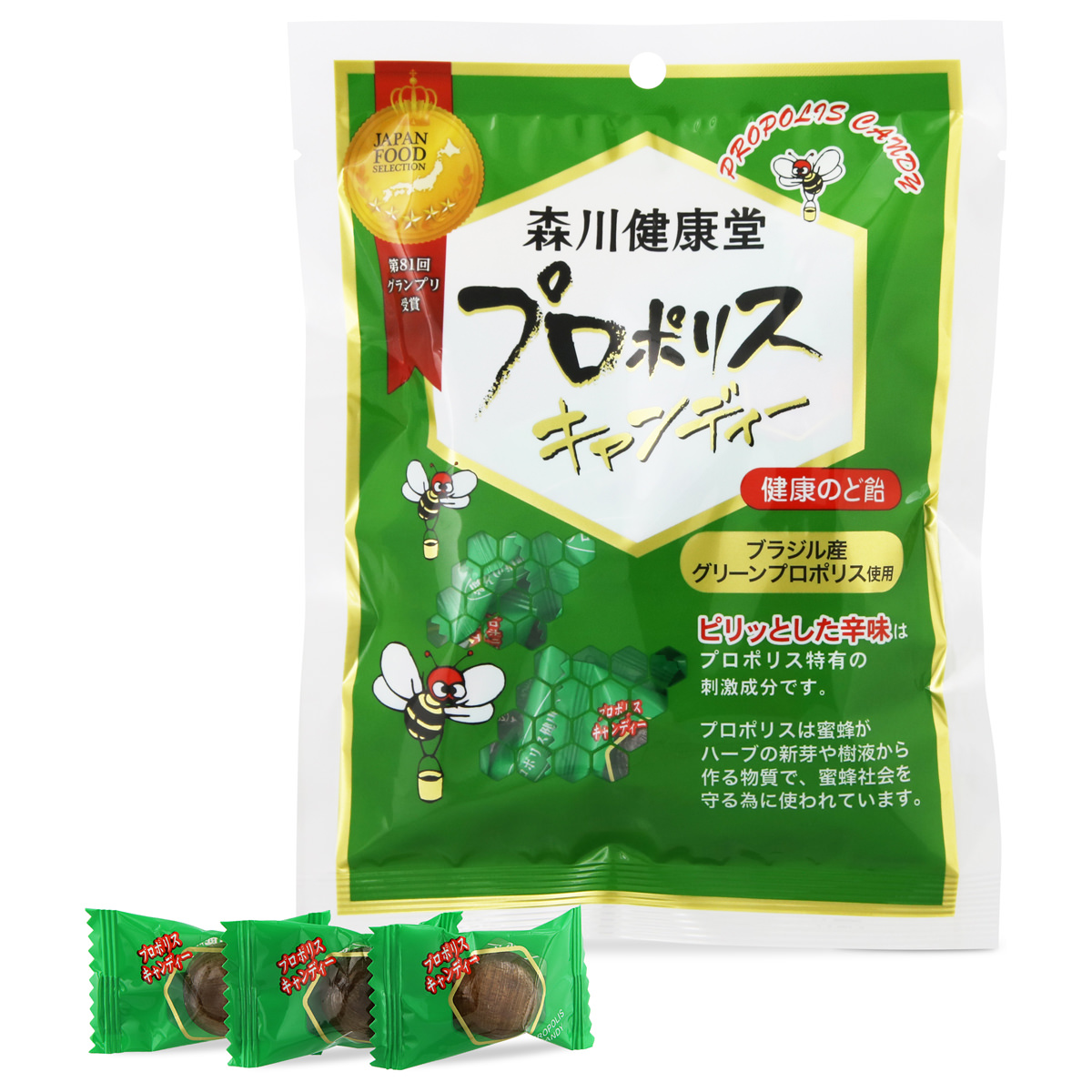 厳選したブラジル産グリーンプロポリスを使用した「森川健康堂 プロポリスキャンディー のど飴」です。プロポリスのピリッとした辛味がクセになります。ブラジル産プロポリスにハチミツやオリゴ糖などを加えた、さっぱりとした甘さののど飴です。「冬の猛威対策」「乾燥時の喉のイガイガ」「春のムズムズ対策」などとして、どなたにでもお召し上がりいただけます。声やのどを大切にしている声優、歌手、アナウンサーの方など、特に声のプロにご愛用いただいている商品です。第81回ジャパン・フード・セレクション食品・飲料部門にてグランプリを受賞しました。(2024年)プロポリスは、ミツバチがハーブの新芽、木の芽、樹液などを集めて作った物質です。ハーブの力を利用し、巣箱を清潔に保つために使われます。※原材料にはちみつを使用しております。1歳未満の乳児には与えないでください。