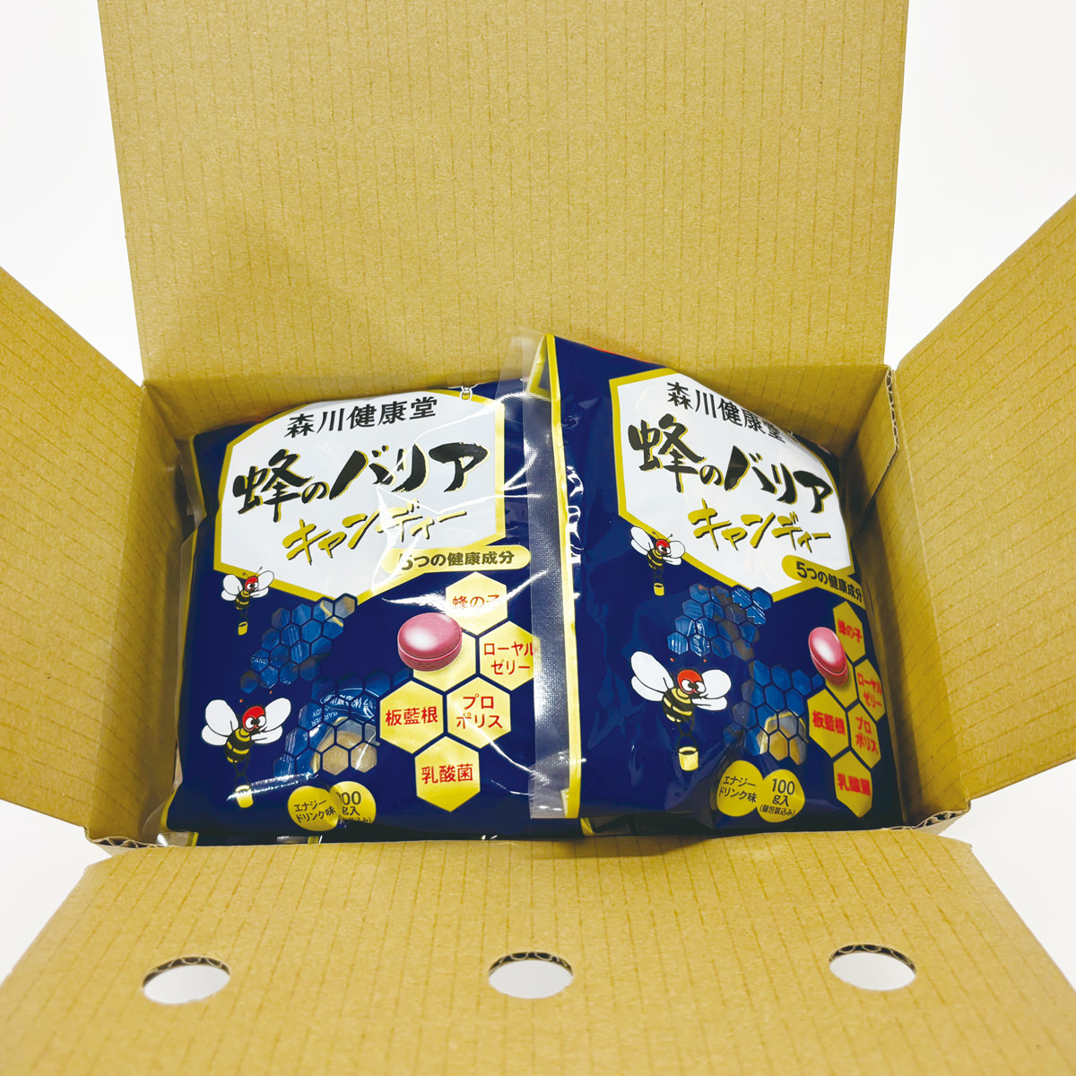 蜜蜂由来原料を使用した「森川健康堂 蜂のバリアキャンディー 飴 エナジードリンク風味」です。蜂の子、ローヤルゼリー、プロポリスの3種類の蜜蜂由来原料に、板藍根(ばんらんこん)、乳酸菌、ビタミンC、ビタミンDなどを加えました。エナジードリンク風味の食べやすい飴です。ピリッとしたプロポリスの風味もお楽しみいただけます。守るチカラや活力が欲しい時、元気な毎日を過ごしたいときなどにおすすめです。ローヤルゼリーはミツバチの体内から分泌される物質で、女王蜂を育てるために使われる特別な栄養源です。プロポリスは、ミツバチがハーブの新芽、木の芽、樹液などを集めて作った物質です。ハーブの力を利用し、巣箱を清潔に保つために使われます。※原材料にはちみつを使用しております。1歳未満の乳児には与えないでください。