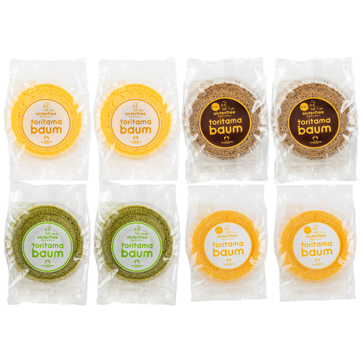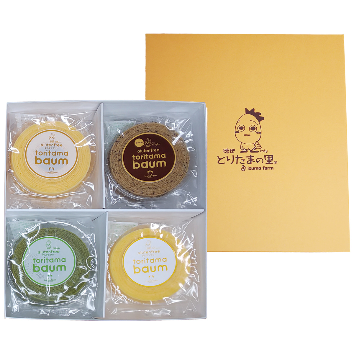 山口県のたまご農家の出雲ファームで採れた卵を主原料にたっぷりと使用した「徳地とりたまの里 グルテンフリー とりたまバウム 詰め合わせ」です。「徳地とりたまの里」は、出雲ファームが営む卵かけご飯専門店です。農場で採れた卵と国産の米粉を原料に使用して、グルテンフリーのバウムクーヘンを作っています。とりたまバウムは米粉で作ったとは思えない程しっとりとした食感に仕上がっています。小麦粉不使用で工場内にコンタミもございません。小麦アレルギーの方やグルテンを控えたい方にもお召し上がりいただけます。お店で人気を集めるプレーン味に加えて、抹茶・コーヒー・レモン味を詰め合わせました。おやつ、お茶請け、お茶菓子などとして、お取り寄せでお楽しみください。化粧箱に入れてお届けしますので、贈答やギフトなどにもご活用ください。