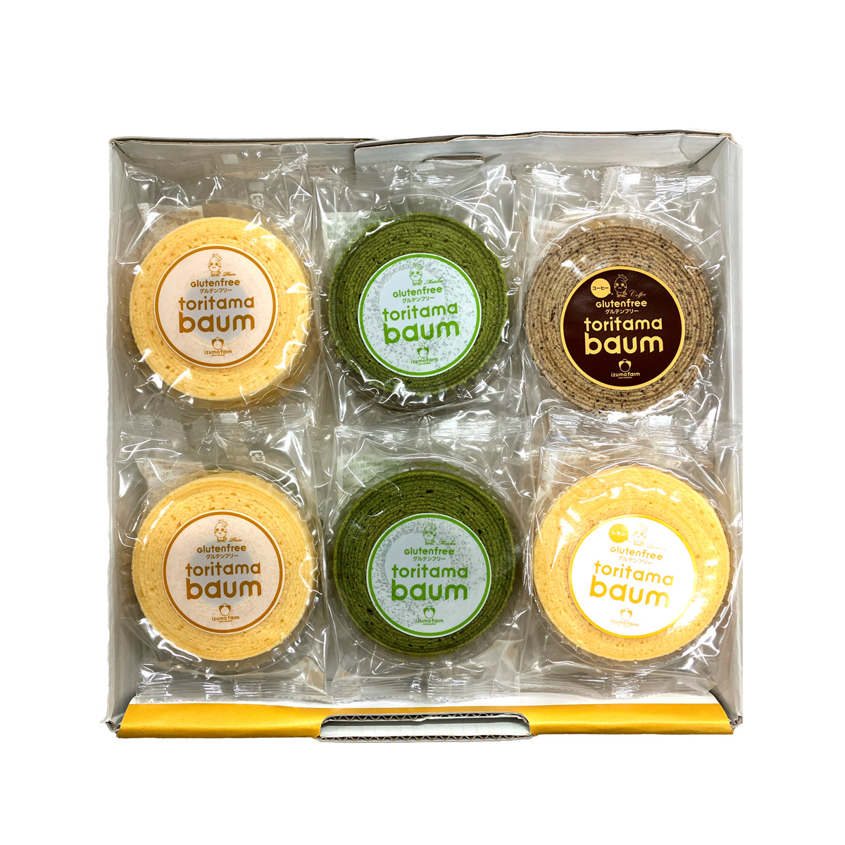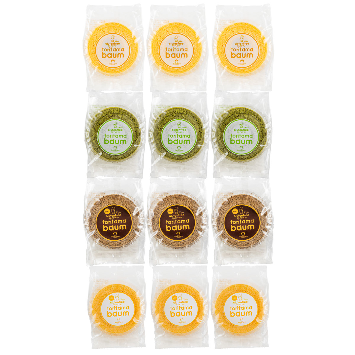 山口県のたまご農家の出雲ファームで採れた卵を主原料にたっぷりと使用した「徳地とりたまの里 グルテンフリー とりたまバウム 詰め合わせ」です。「徳地とりたまの里」は、出雲ファームが営む卵かけご飯専門店です。農場で採れた卵と国産の米粉を原料に使用して、グルテンフリーのバウムクーヘンを作っています。とりたまバウムは米粉で作ったとは思えない程しっとりとした食感に仕上がっています。小麦粉不使用で工場内にコンタミもございません。小麦アレルギーの方やグルテンを控えたい方にもお召し上がりいただけます。お店で人気を集めるプレーン味に加えて、抹茶・コーヒー・レモン味を詰め合わせました。おやつ、お茶請け、お茶菓子などとして、お取り寄せでお楽しみください。化粧箱に入れてお届けしますので、贈答やギフトなどにもご活用ください。
