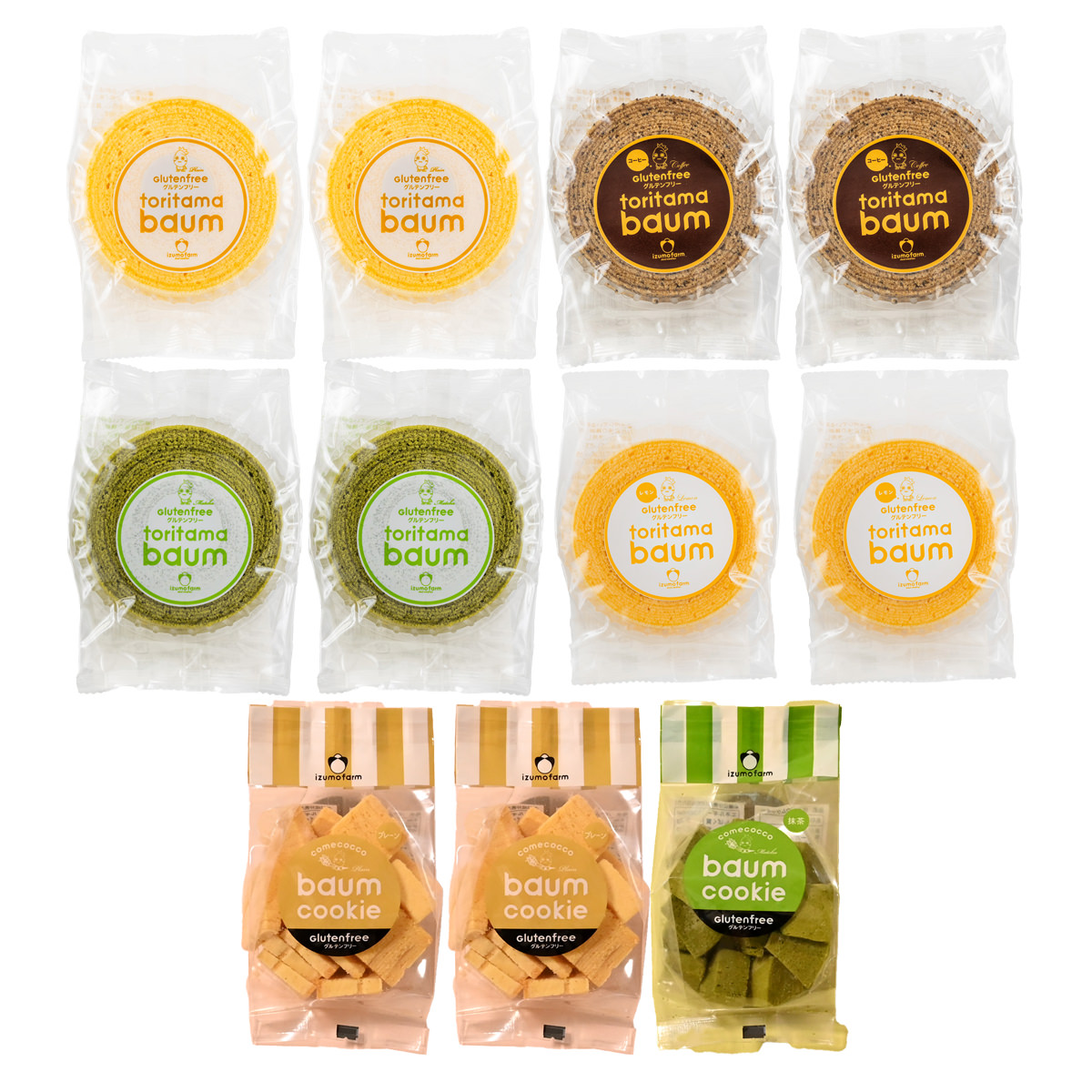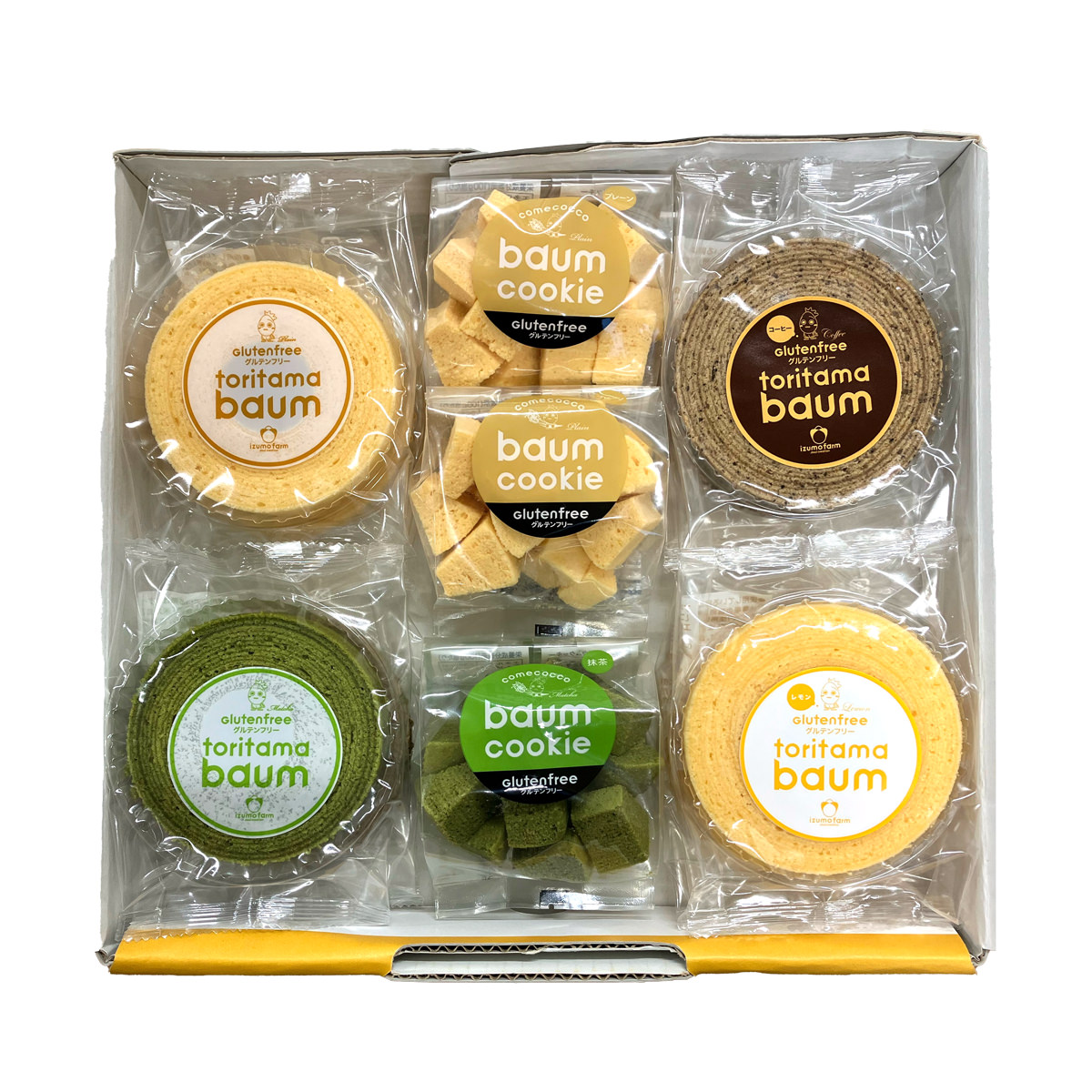 ●数量・内容:とりたまバウム(プレーン、抹茶、コーヒー、レモン) 各65g×2、バウムクッキー(プレーン70g×2、抹茶70g×1)