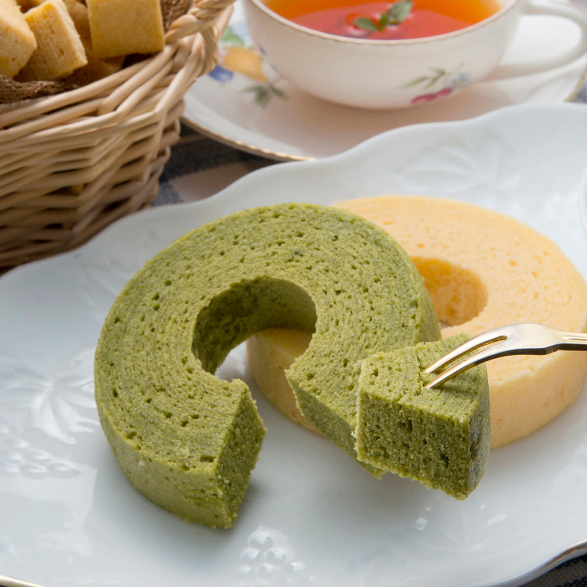 <バウムクッキー 抹茶>卵(山口県徳地産)、砂糖、マーガリン、米粉、乳等を主要原料とする食品、コーンスターチ、ショートニング、水飴、澱粉、果糖ブドウ糖液糖、抹茶/トレハロース、クロレラエキス、乳化剤、ベーキングパウダー、香料、クチナシ色素、(一部に卵・乳成分・大豆を含む)