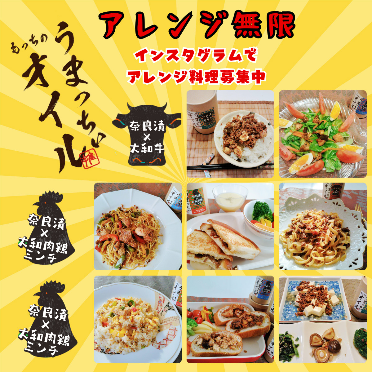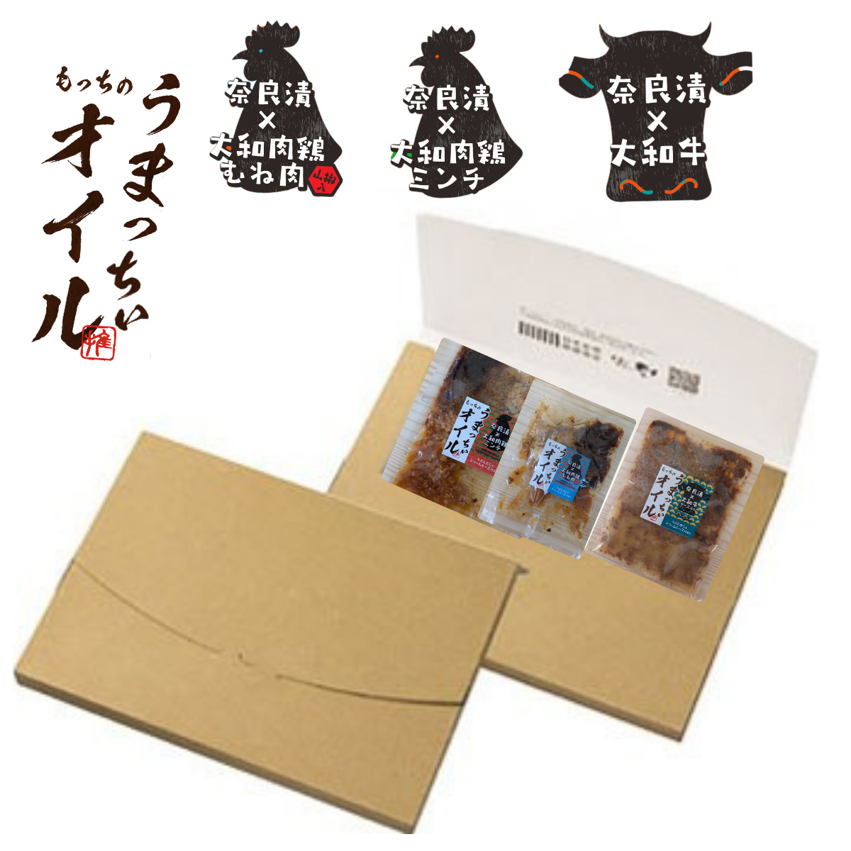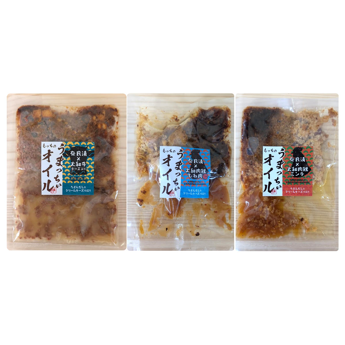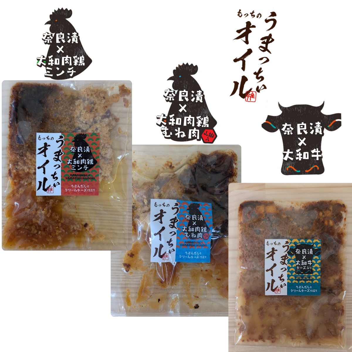「もっちのうまっちぃオイル漬け 奈良漬 詰め合わせ」は、奈良県生駒市出身、よしもと住みます芸人のもっち氏と目利氣目利氣358(メキキ358)との連携で開発した商品です。原料に、奈良の特産品である奈良漬けと、奈良が誇る黒毛和牛ブランド「大和牛(やまとうし)」や地鶏ブランド「大和肉鶏(やまとにくどり)」を使用し、特製のオイルに漬け込みました。ベースに、W旨味コクうどんだしつゆ(奈良県生駒市にある匠の技にこだわる堀内栄養研究社のうどんだし)、まろやかさとコクを引き出すクリームチーズを使用。ご飯のお供、おかず、おつまみのほか、サラダや冷ややっこのトッピング、パスタやブルスケッタの具材など、幅広くお使いいただけます。大和牛ミンチチーズ入り、大和肉鶏ミンチ、大和肉鶏ムネ山椒いりをセットにしました。3種を食べ比べてお楽しみください。{食べ方}そのまま常温でお召し上がりいただけます。電子レンジで温める場合は耐熱容器に移しかえ、ラップをして温めてください。加熱時間は機種・W(ワット)数により異なります。