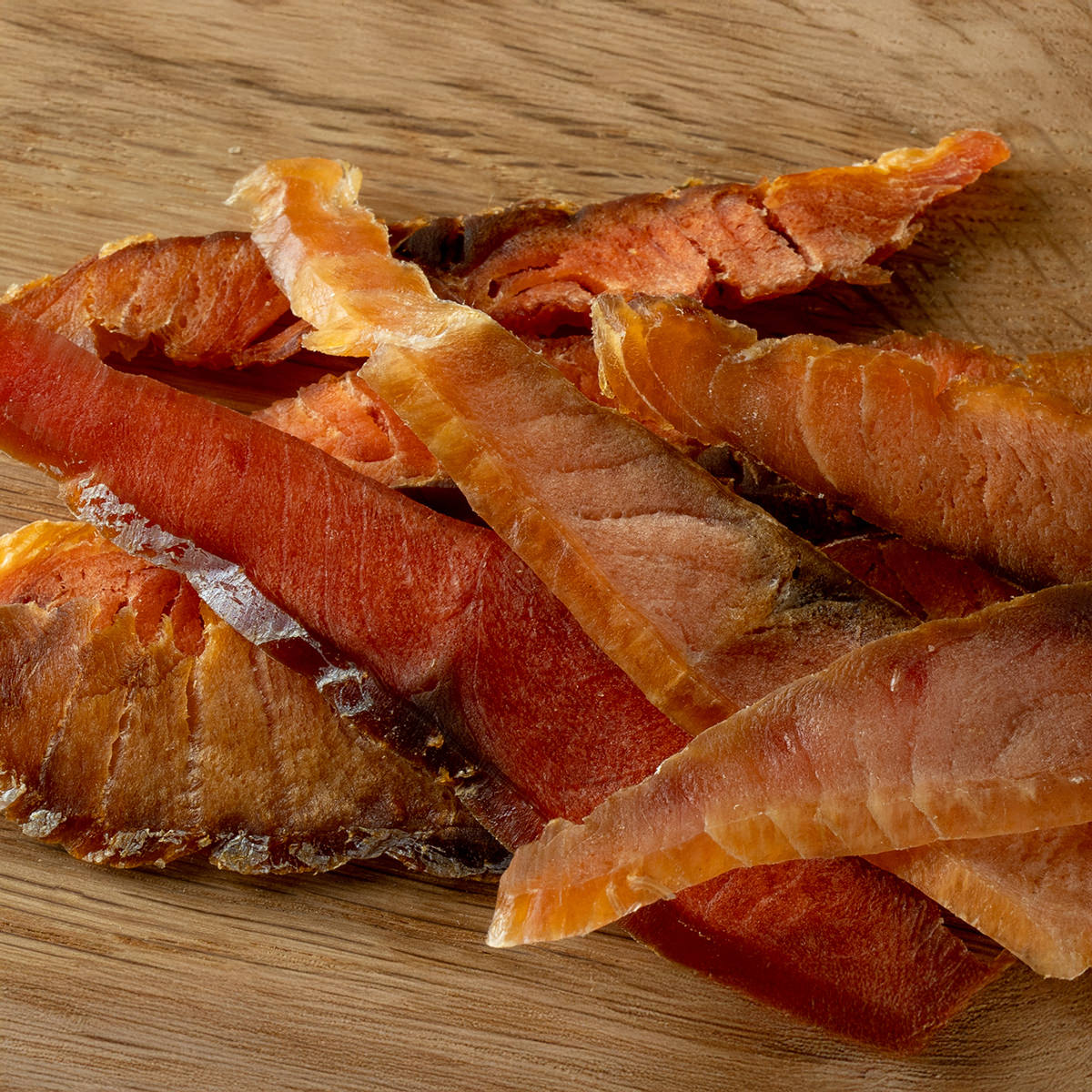 <サーモンのうす切りとば>鮭(北海道産)、砂糖、食塩、昆布だし、かつおだし、しいたけだし、さんま魚醤、米黒酢、(一部にさけを含む)