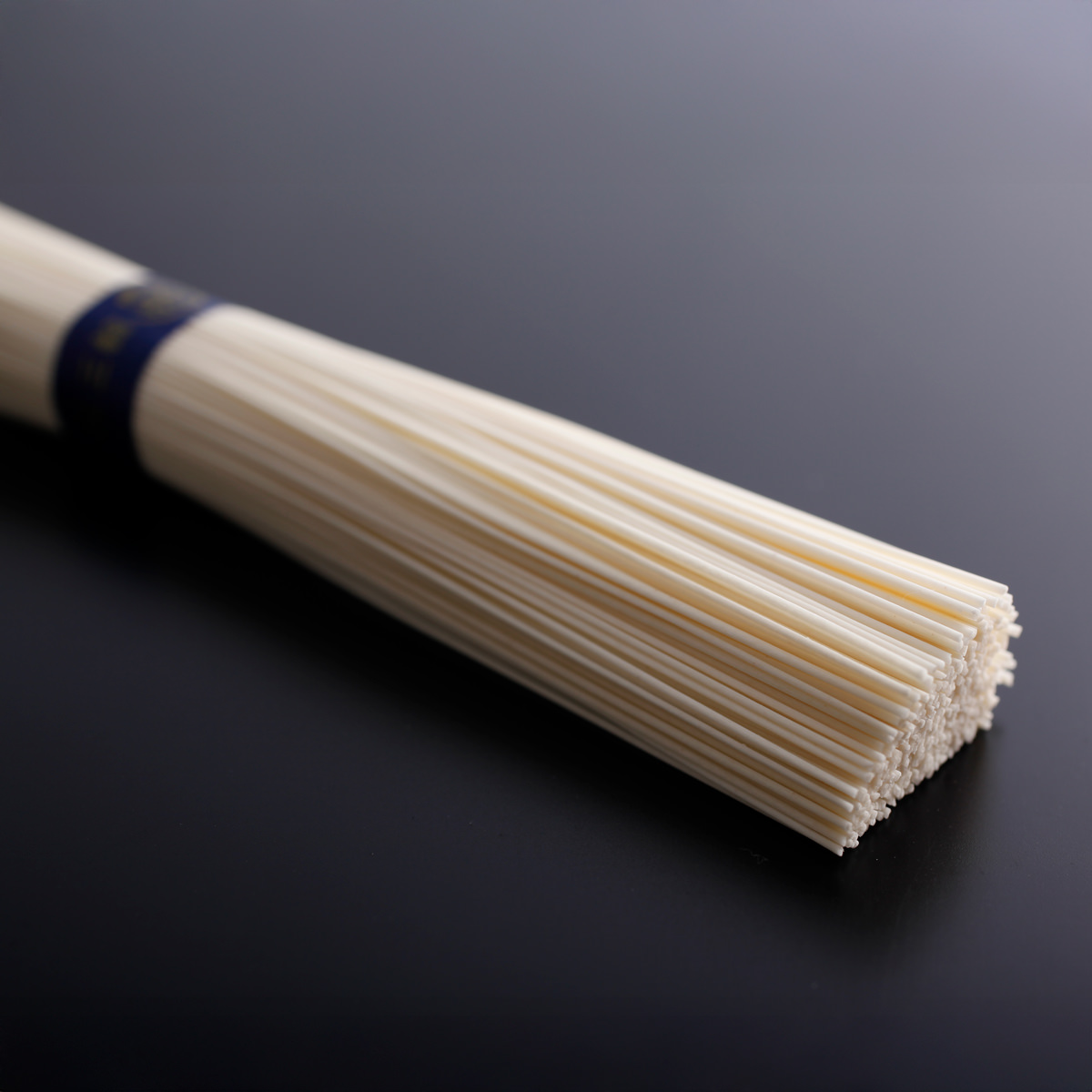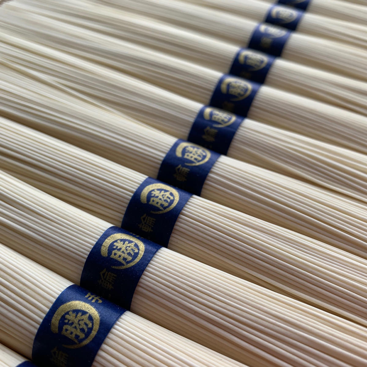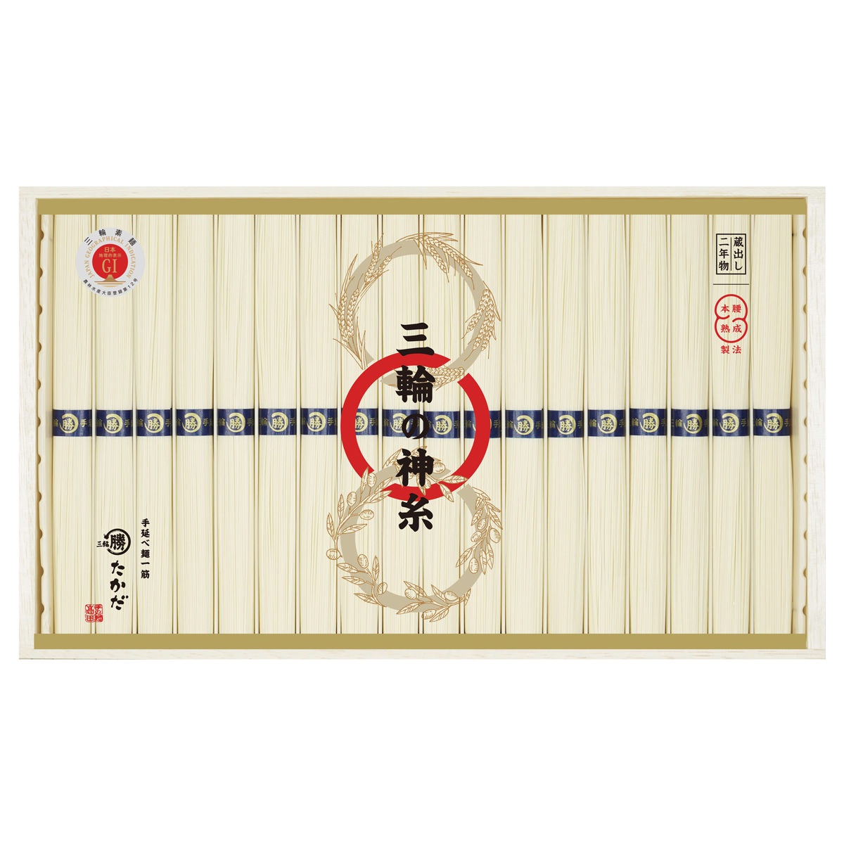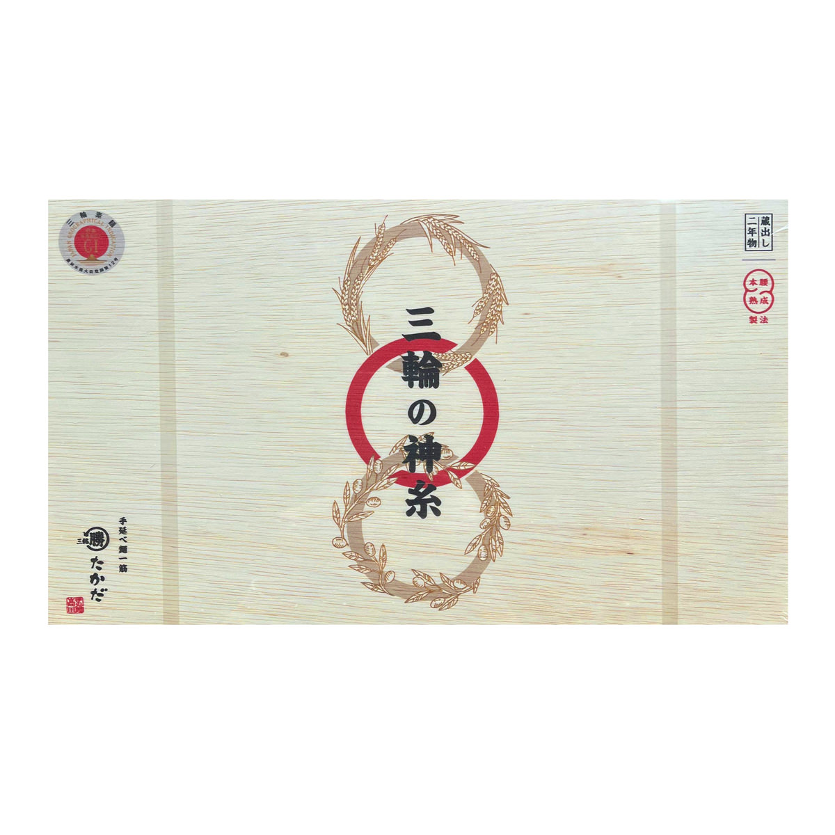 「三輪素麺 マル勝高田商店 三輪の神糸」は、手延べ麺一筋、奈良県桜井市のマル勝高田商店こだわりの製法「本腰熟成製法」で丁寧に製麺された三輪素麺です。2種のオリジナルブレンドの小麦粉、イタリアから直輸入したエキストラバージンオリーブオイル、強い粘りに欠かせない国産の赤穂の塩といったこだわりの原材料を使用し、丹念に仕上げています。三輪素麺の特徴であるのどごしと歯ごたえをお楽しみください。常温で長期保存が可能な乾麺です。シンプルにめんつゆにつけてお召し上がりいただくほか、さまざまなアレンジレシピにも活用できます。冷たい麺でも温かい麺でも美味しくお召し上がりいただけますので、季節を問わずご利用ください。木箱に入れてお届けしますので、ギフトや贈答品にもご利用いただけます。{調理方法}沸騰したお湯で約2分ゆでてください。