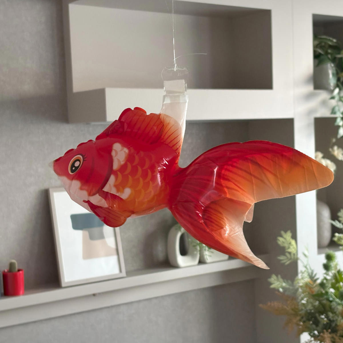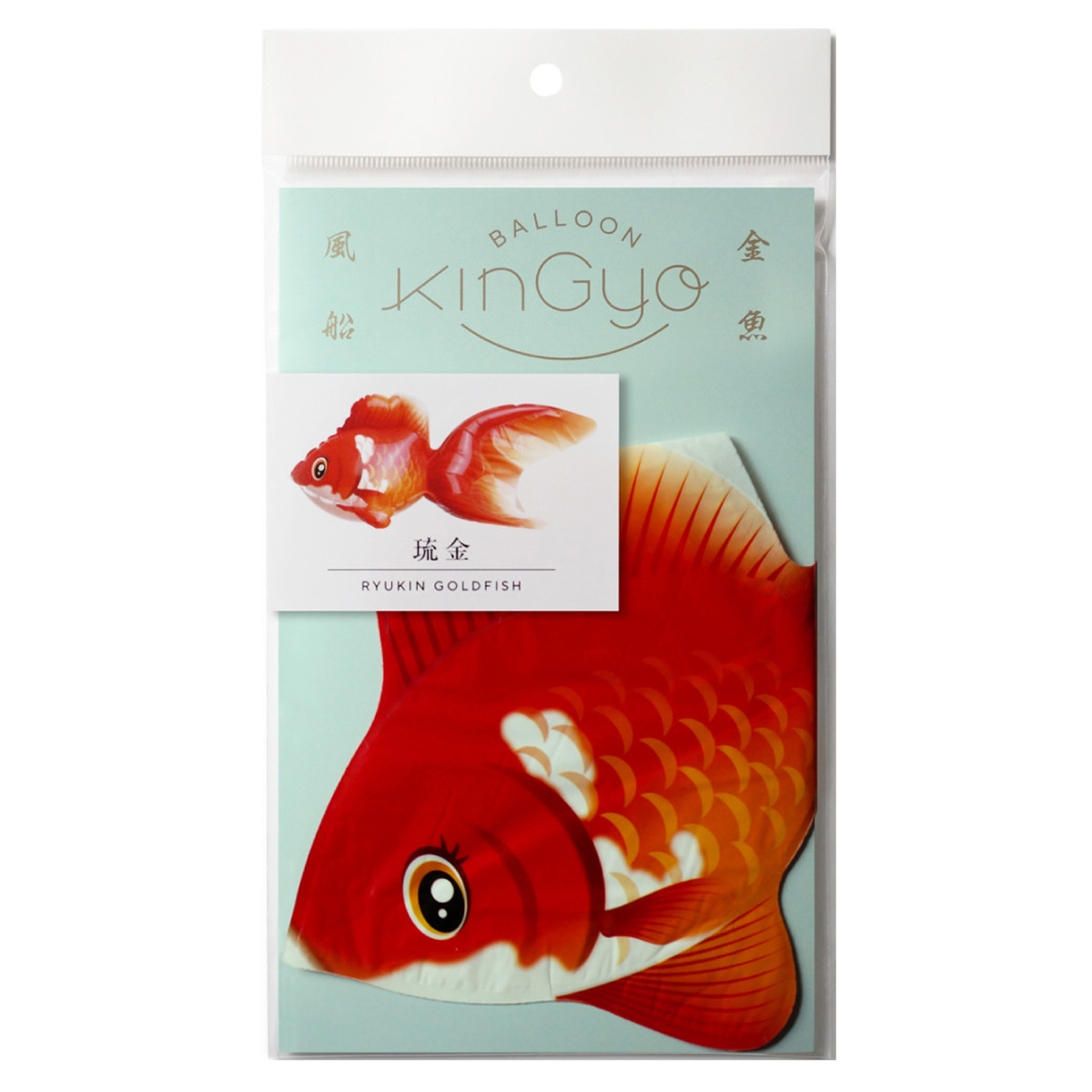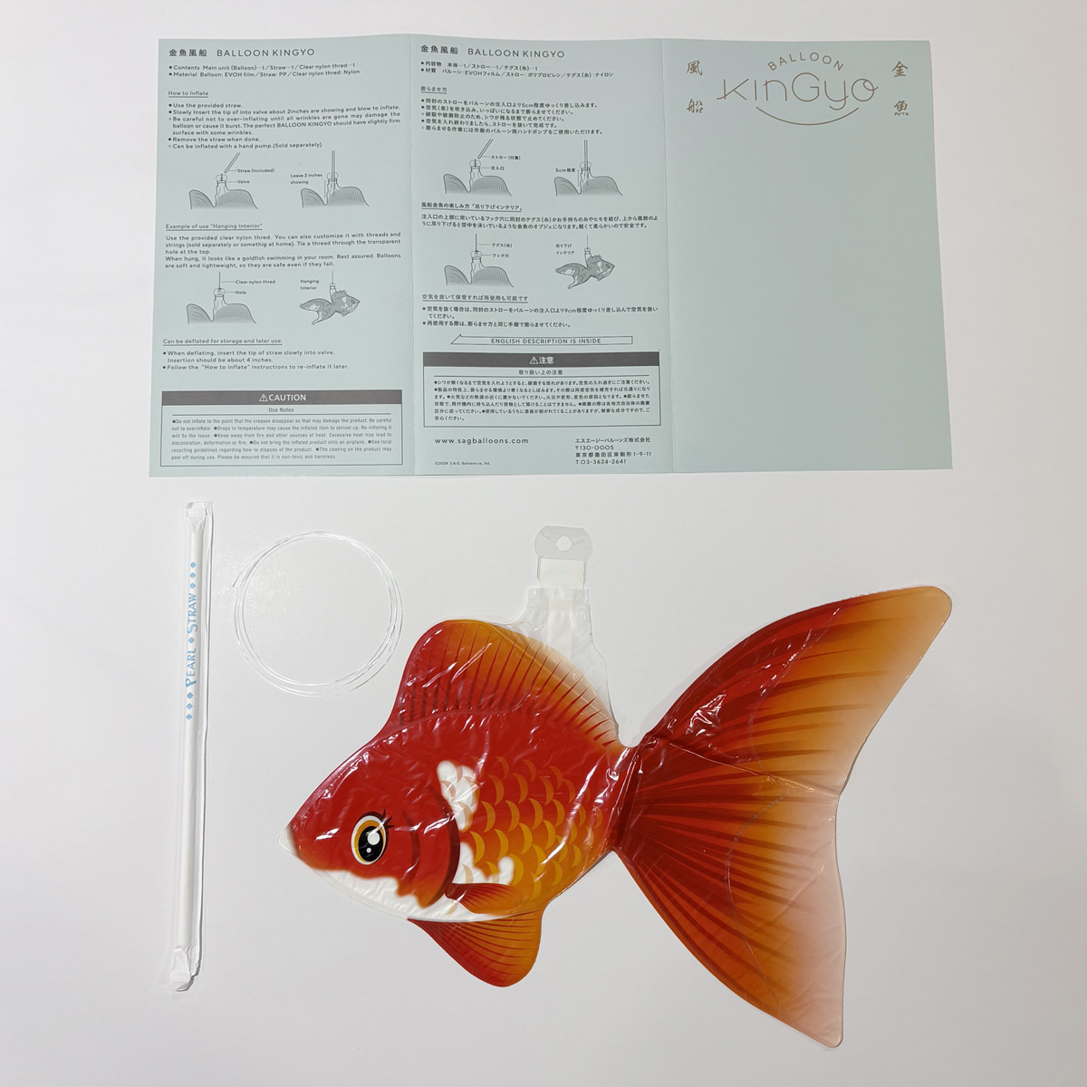 金魚がモチーフの風船「KINGYO BALLOON 金魚風船 琉金」です。国産素材を使用した日本製のバルーンです。昭和レトロやインバウンド熱から再注目の金魚。膨らませて、同梱のテグス糸を使って風鈴のように吊るすと、お部屋を彩る和モダンな”つるし飾り”に早変わりします。注入口の上部に突いているフック穴にお手持ちの糸やヒモを結び、上から吊り下げると、空中を泳いでいるような琉金(りゅうきん)のオブジェになります。お腹の部分で自立もしますので、置物として飾ることも可能です。ただ、非常に軽いため、強風で飛ばされる可能性もあります。その際は粘着テープ等で固定するのがおすすめです。【対象年齢7歳以上】{膨らませ方}付属の専用ストローを注入口に差し込んで空気(息)を吹き込んで膨らませる(市販のバルーン用ハンドポンプの使用も可能)。空気を抜く際は、付属の専用脱気ストローを使用する。{使用上の注意}フィルムバルーンはゴム風船とは異なり、伸びながら膨らみません。破損の原因となるので、空気の入れすぎにご注意ください。火災、変形、変色の原因となるため、熱源の近くに置かないでください。