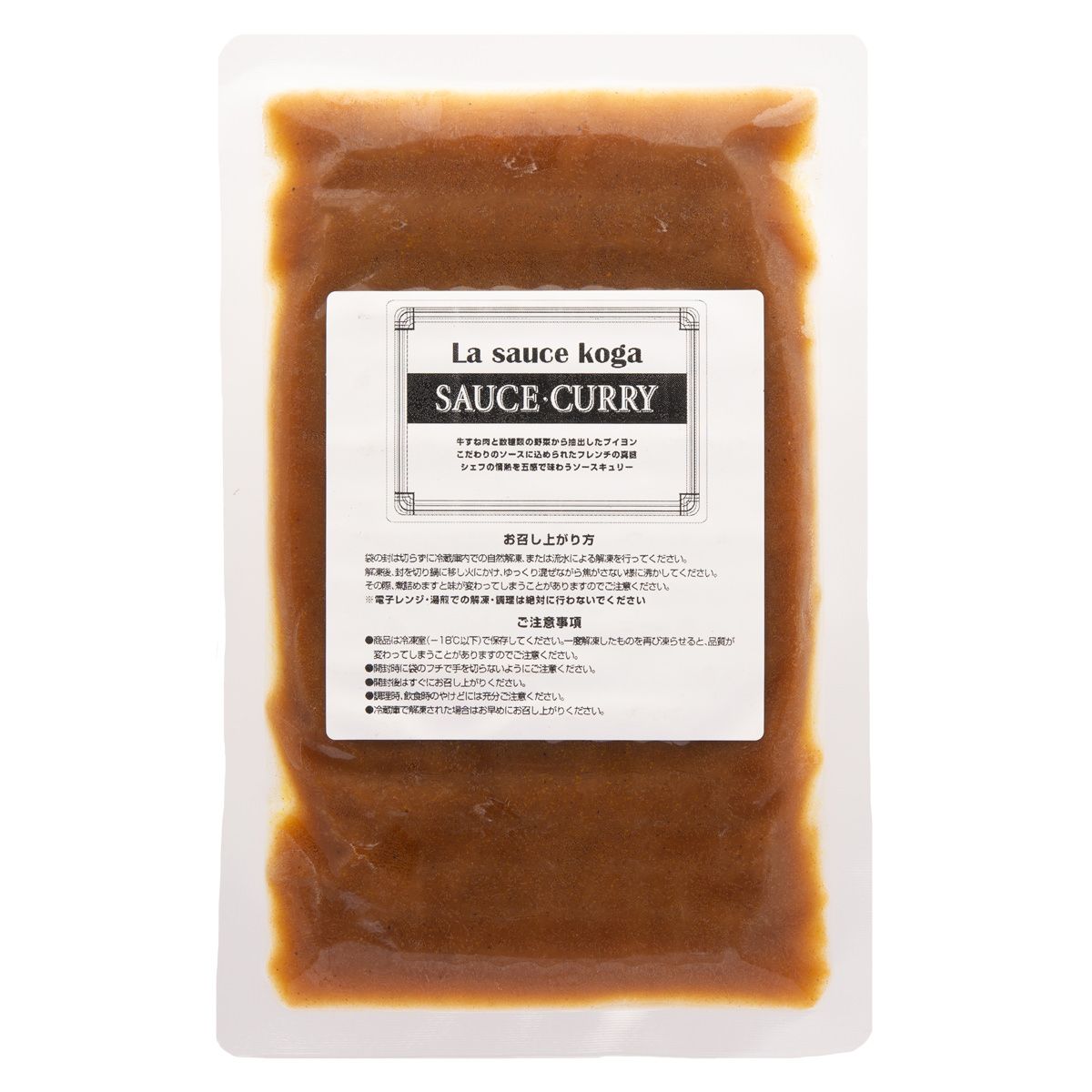 代々木上原にある本格フレンチレストランの名店「ラ・ファソン古賀」オリジナルカレーソース(冷凍)。「ラ・ソース古賀 ソースキュリー 冷凍カレーソース」は、具なしでサラリとしていながら、満足を得られるカレーソースです。「ソースキュリー」はフランス語で「カレーソース」を意味します。和牛のすね肉と玉ねぎ、にんじん、トマト、セロリ、ニンニクなどの香味野菜からブイヨンを抽出し、スパイスやカレールー、赤ワインの風味を加え、余分な油や雑味を取り除いて作り上げています。胃もたれしにくく、何度でも食べたくなる逸品です。食材の旨み、豊富なコラーゲンとビタミンが溶け込んでいます。野菜の自然な甘みを求めるヘルシー志向の方にこそお勧めしたい、スープのようにサラッとお召し上がりいただけるカレーソースです。「ラ・ファソン古賀」古賀義英シェフによるフレンチの技法が生きています。カレールーと異なり、鍋で温めるだけでお召し上がりいただけます。冷凍でお届けしますので、解凍後に加熱してからお召し上がりください。{調理方法}封を切らずに冷蔵庫内で自然解凍あるいは流水解凍した後、中身を鍋に移して火にかけてください。焦がさないように、ゆっくり混ぜながら温めてください。電子レンジ・湯煎での解凍・調理不可。