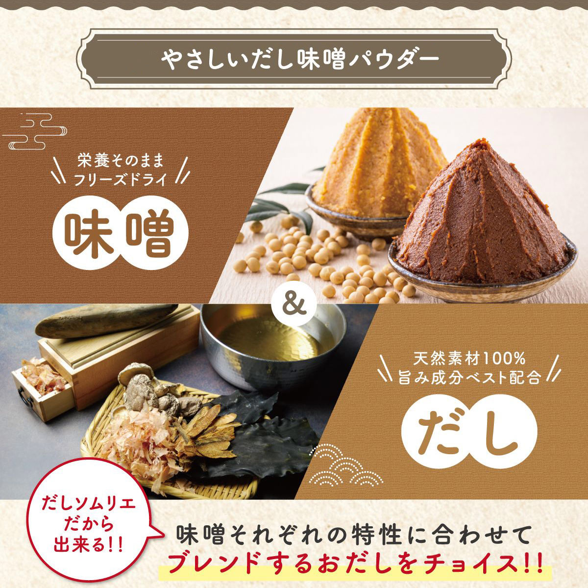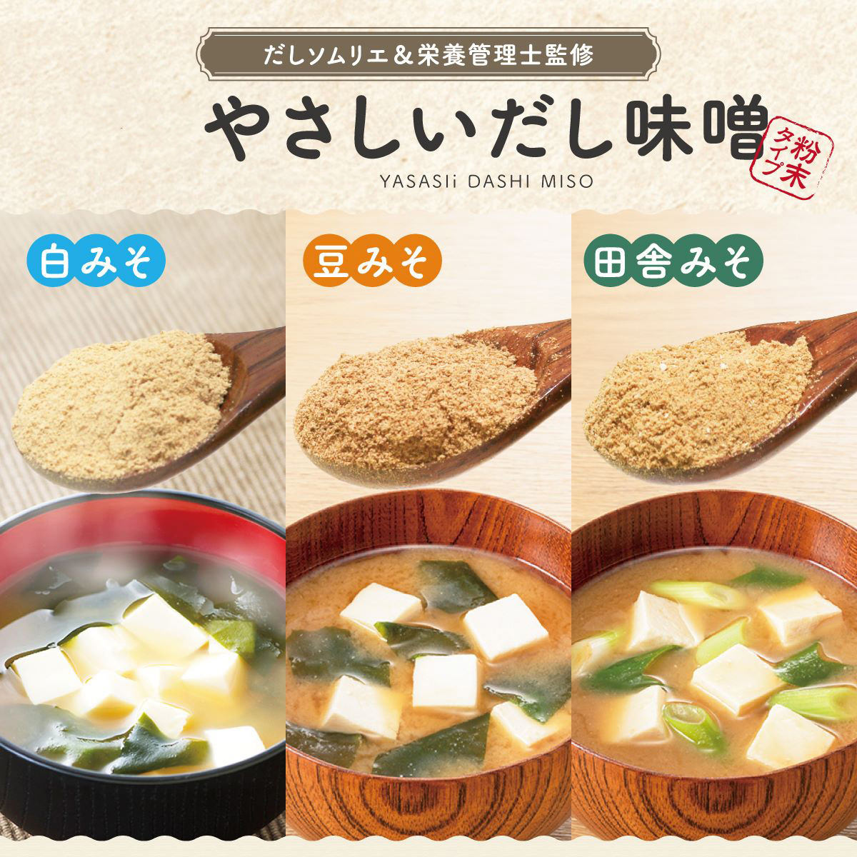 昭和21年(1946年)創業の水産加工会社が作った「mizunoto だし味噌 粉末みそ 食べ比べセット」です。だしソムリエ認定講師が厳選しただし素材と、フリーズドライの味噌パウダーを独自の配合でブレンドしています。お好みの量をお湯に入れてさっと溶かすだけで、出汁香る本格だし味噌汁の完成です。うまみ調味料や保存料、着色料など一は切不使用。厳選素材を使ったおいしい天然だし味噌汁をぜひご堪能ください。白みそ、豆みそ、田舎みその3種をセットにしました。それぞれ異なる味わいを食べ比べてお楽しみください。<白みそ>ほんのりとした甘さとまろやかなコクを楽しめます。<豆みそ>東海地方を代表する、濃厚で深い旨味を持つ味噌です。<田舎みそ>甘み、旨み、香りのバランスが良い味噌です。{調理方法}お椀やお鍋に本商品を入れ、お湯を注いでお召し上がりください。お好みの濃さでお召し上がりください。(小さじ1杯あたり約100mlのお湯が目安です)