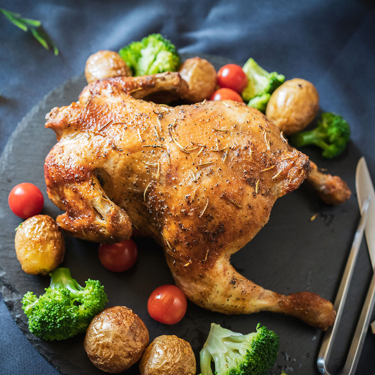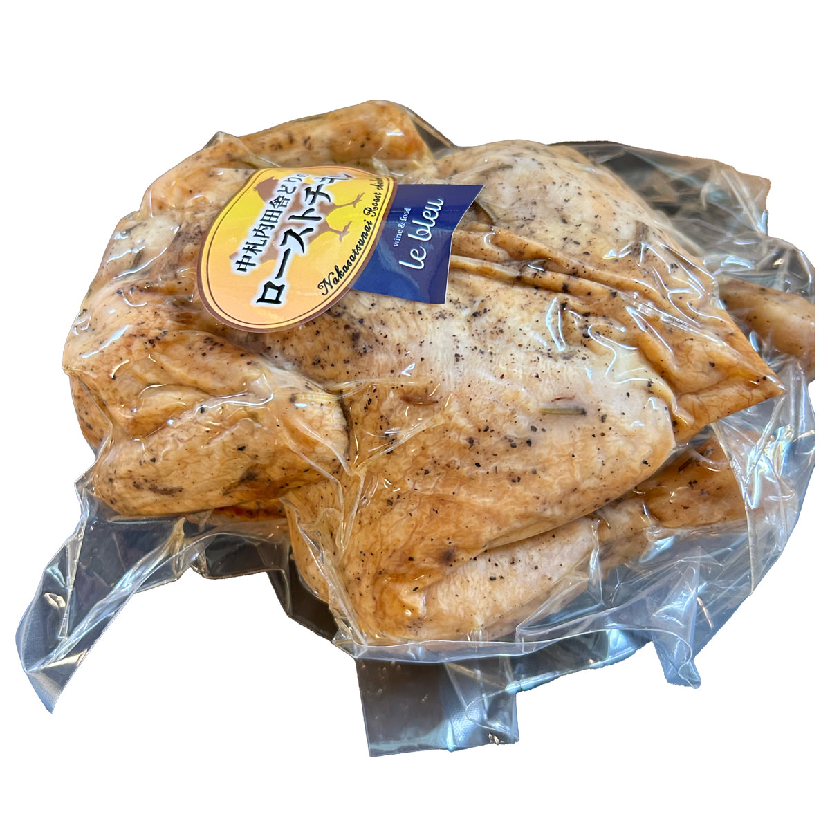 「北海道 le bleu 中札内田舎どり 一羽 ローストチキン」は、中札内村(なかさつないむら)の銘柄鶏「中札内田舎どり」を贅沢に一羽丸ごと使用したローストチキンです。丸鶏を新鮮な生の状態で工場から直接仕入れ、手作業で1羽ずつ丁寧に仕込み、ヨーロッパ製のロティサリーオーブンでじっくり焼き上げました。真空冷蔵することで旨味を逃がさずにお届けします。仕入れから出荷まで一切冷凍しないため、新鮮な鶏肉の旨味やジューシーさを損なうことなく、湯煎するだけの簡単調理で北海道産銘柄鶏の本格ローストチキンが楽しめます。湯煎した後に袋から取り出し、表面にオリーブオイルを塗ってからオーブンで焼き上げると、外側の皮目がパリッとして、中はしっとりしたローストチキンに仕上がります。クリスマスやお祝いなど、特別な日のメインディッシュ、おもてなし、パーティーメニューなどとして、お取り寄せでお楽しみください。{調理方法}全体がお湯に浸かる大きめの鍋で、真空パックのままゆっくりと湯煎で加熱する(約7~10分)。加熱後に袋からチキンを取り出し、お好みで約200℃に予熱したオーブンで5分ほど焼き上げる。