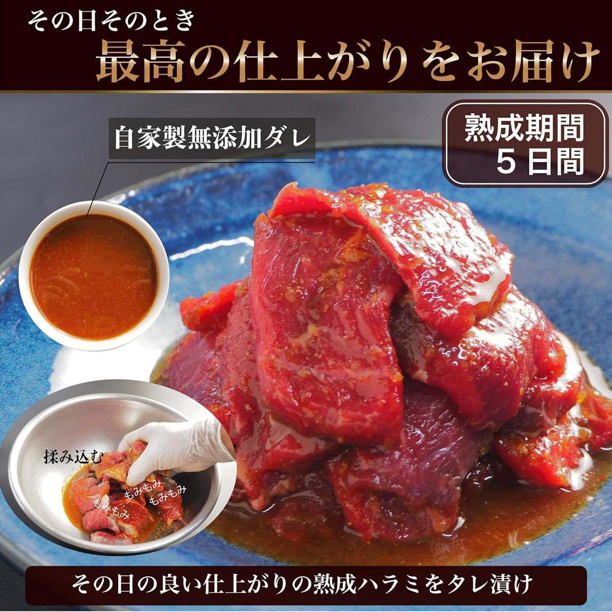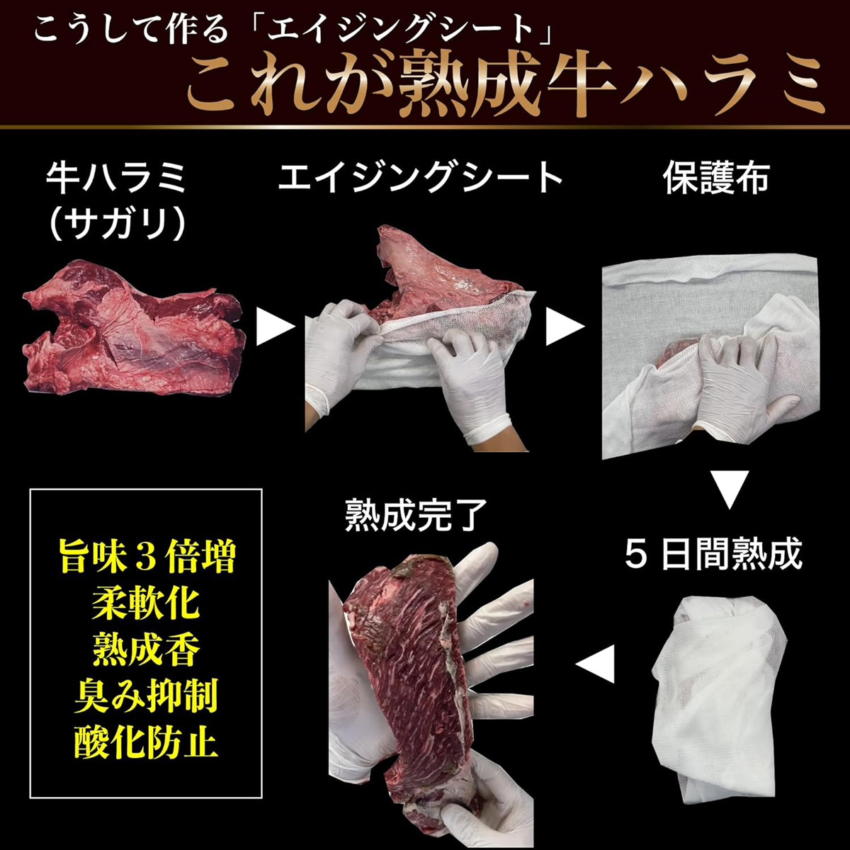 ”エイジングシート”という明治大学と共同開発した新しい発酵技術で作られた「旬熟成 熟成牛 ハラミ」です。素材に、厳選したアメリカ産の牛ハラミ(サガリ)を使用。鮮度の良い状態でエイジングシートをまいて、5日間の熟成を施します。発酵菌により酸化が抑えられ、牛ハラミ特有の内臓臭がほぼゼロに。エイジングシートにより全く臭みのない熟成大とろ牛ハラミに仕上がります。その熟成ハラミを自家製の焼肉のタレで漬け込むことで、さらに旨味がUP。冷凍しても鮮度の良い状態で保存されます。発酵菌はしっかりと安全性試験をクリアし、人体無害の裏付けをとっており、定期的に食品検査も実施しております。ご自宅での焼き肉はもちろん、バーベキュー(BBQ)やキャンプなどの食材としても大活躍。普段なかなか口にできない熟成牛ハラミをお取り寄せでご堪能ください。{食べ方}解凍後、熱したフライパンでじっくり焼き上げてください。レア気味に焼き上げると味わい深く、サクッとした歯切れの良さと柔らかさを楽しめます。