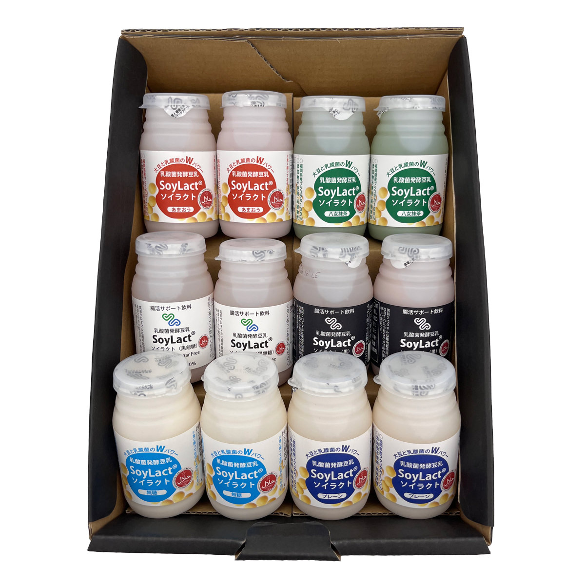 「アガペファーム ソイラクト 豆乳 詰め合わせ ギフトセット」は、福岡県産を中心とした九州産の大豆を原料に、植物由来の乳酸菌で長時間発酵させた添加物不使用・純植物性の飲料です。無糖、プレーン、あまおう、八女抹茶、黒無糖、黒の6種類を詰め合わせました。贈答用の化粧箱に入れてお届けしますので、プレゼント、贈り物、ギフトなどにもご利用ください。<無糖>九州の名産大豆(フクユタカ)を糖質無添加で乳酸菌発酵。キレのある酸味がクセになります。<プレーン>フクユタカを惜しみなく使用。クセがなく飲みやすいので、お好きなフルーツや野菜とミキシングするのもおすすめ。<あまおう>福岡県特産あまおうのピューレを加えました。<八女抹茶>八女茶の抹茶ペーストを加えました。<黒無糖>小粒ながら甘味の強い美味しい黒大豆”筑前クロダマル”を使用。<黒>筑前クロダマルを使用し、てんさい糖で軽く甘味をつけました。開封前によく振ってから、1日1本(100ml)を目安にそのままお飲みください。