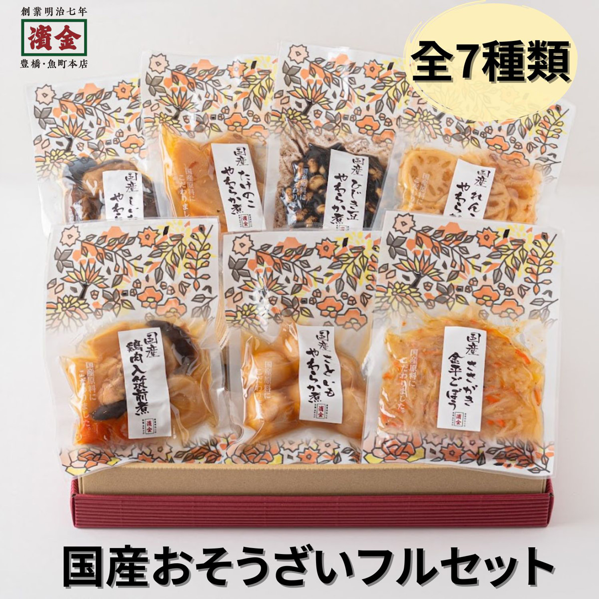 濱金商店(はまきんしょうてん)の国産おそうざい全7アイテムをセットにしました。ギフトにもご自宅用にもおすすめです。<国産しいたけやわらか煮>国産の乾燥椎茸だから滋味と栄養がしっかり熟成されてます、深い味わいをどうぞ。<国産たけのこやわらか煮>国産筍をやわらかく炊き上げました。しっかりと味が染みています。<国産ひじき豆やわらか煮>ヘルシーな海の幸に栄養豊富な山の幸をあわせた伝統のおかず。<国産れんこんやわらか煮>国産蓮根のシャキシャキ感を活かしました。先の見通せる古来の縁起物。<国産鶏肉入筑前煮>国産鶏肉の旨味が全部国産の野菜それぞれに染みて、深い味わいを楽しめます。<国産さといもやわらか煮>箸でそのまま切れる程にやわらかく炊き上げました。<国産ささがき金平ごぼう>昔ながらのやさしい味わいの和風惣菜。新鮮な国産のささがきごぼうと人参を、素材の味が活きるように味付けしました。{食べ方}食卓にもう1品。そんな時に封を開けてそのまま美味しく召し上がれます。温めるときは、開封して別の容器に移してください。開封後は冷蔵にて保存し、賞味期限に限らずお早めにお召し上がりください。