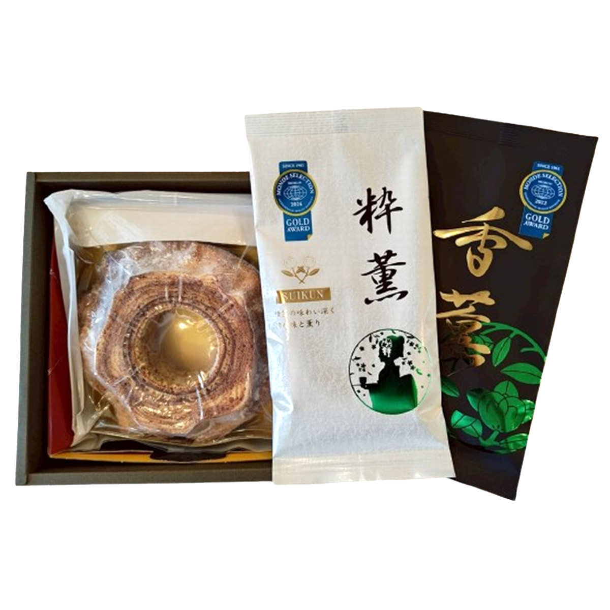 静岡県藤枝市のバームクーヘン専門店”Baum薫~ばあむくん~”がお届けする「Baum薫 バームクーヘン ハード 煎茶2種 ギフトセット」です。日本ギフト大賞2023「静岡賞」を受賞したバームクーヘン『ハード』、香り・甘味・旨味を追求した、モンドセレクション2024金賞受賞茶『香薫(こうくん)』『粋薫(すいくん)』をセットにしました。<ハード>香ばしく焼きあげたキャラメルのようでいて、もっちりとした新感覚のバームクーヘン。発酵バターの香りが豊かでアーモンドの薫りが際立つ逸品。<香薫>香ばしい香りと甘味のある味・鮮やかな水色が特徴。遠赤外線焙煎機械で香ばしく仕上げたお茶を使用し、更に甘味と水色の良い茶葉をブレンドしています。<粋薫>持つ爽やかな香りと甘味のある味わい、鮮やかな水色が特徴。深蒸し製法にてお茶の鮮やかな水色と旨味を引き出した後、熟練の茶師による特殊焙煎がされています。※バームクーヘンは25℃以下の涼しいところで保存してください。茶葉は高温・多湿を避けて保管し、移り香にご注意ください。お茶は鮮度が大切ですので、開封後はお早めにお飲みください。