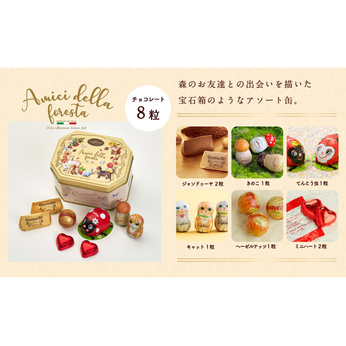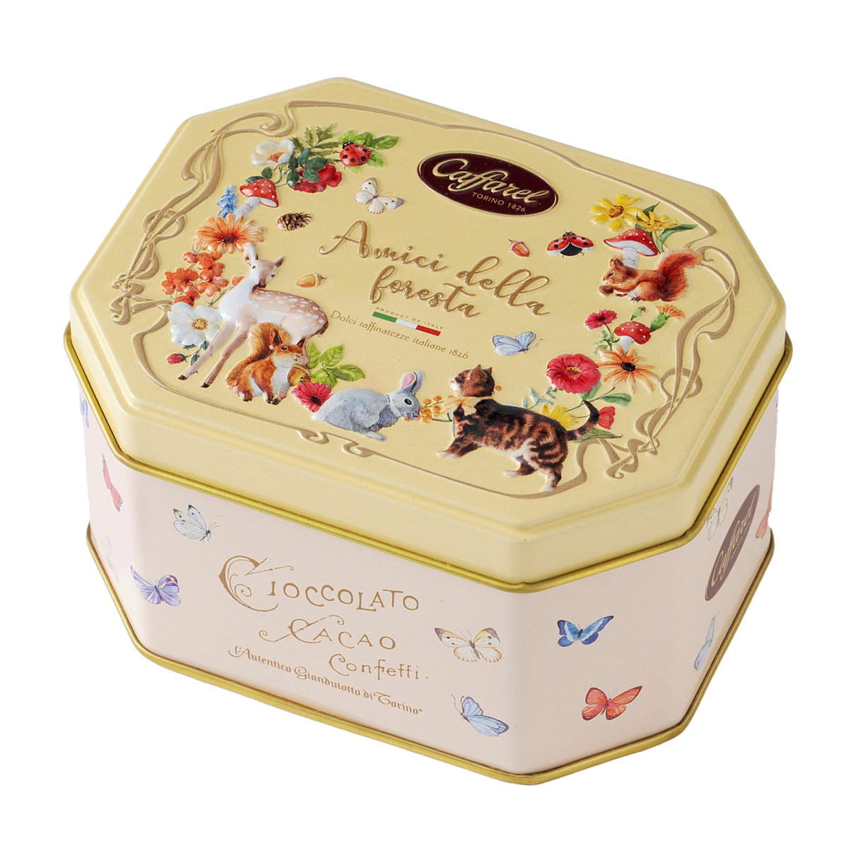 ジャンドゥーヤをはじめ、計8粒のチョコレートをアソートした「カファレル アミーチ・デッラ・フォレスタ チョコレートギフト」です。ジャンドゥーヤ、きのこ、てんとう虫、キャット、ヘーゼルナッツ、ミニハートの個包装チョコレートをおしゃれな缶に詰め合わせました。缶には森に迷い込んだネコが動物たちに出会うシーンが描かれています。おやつやティータイムのお供などとして、お取り寄せでお楽しみください。おしゃれな缶入りチョコレートですので、プレゼント、贈り物、プチギフトなどにもおすすめです。※きのこ、てんとう虫、キャットの色は、ランダムで入ります。