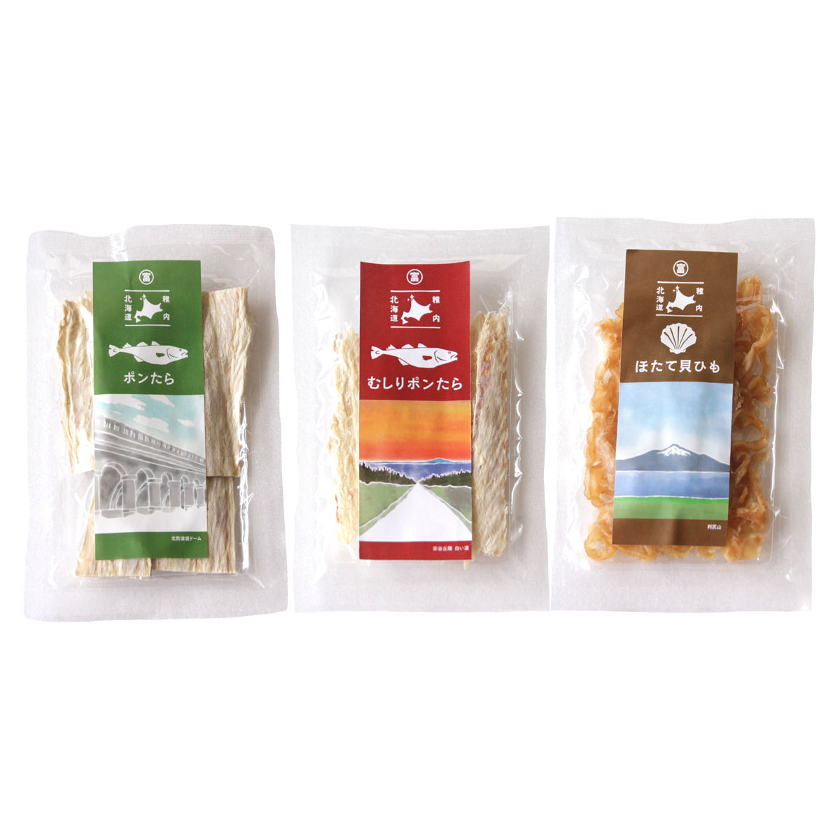 「北海道 まるとみ 最北端の乾燥珍味 詰め合わせ」は、昔から北海道稚内の地元民に愛されている珍味(ポンたら・ほたて貝ひも・むしりポンたら)の食べ比べセットです。北海道の豊かな海で育った厳選素材を使用し、こだわりの製法で加工しています。北海道の味覚をぜひお楽しみください。素材本来の風味を味わっていただくため、味付けは最低限にしています。噛めば噛むほど溢れ出るうまみ。一度食べると手が止まりません。本来の風味を逃さないように、食べきりサイズにしています。色々な味を試せるのがうれしいポイントです。パッケージのデザインには、稚内の観光名所(北防波堤ドーム・宗谷丘陵白い道・利尻山)がそれぞれ描かれています。稚内を訪れたことがある方もそうでない方にもおすすめです。
