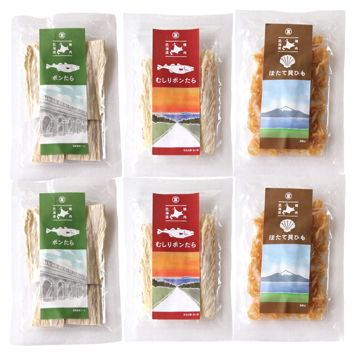●数量・内容:ポンたら28g、ほたて貝ひも36g、むしりポンたら20g 各2