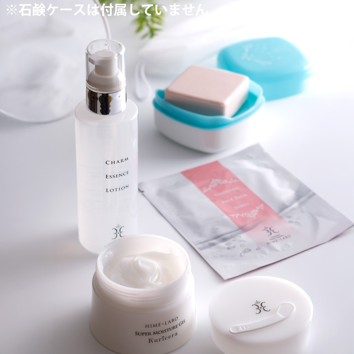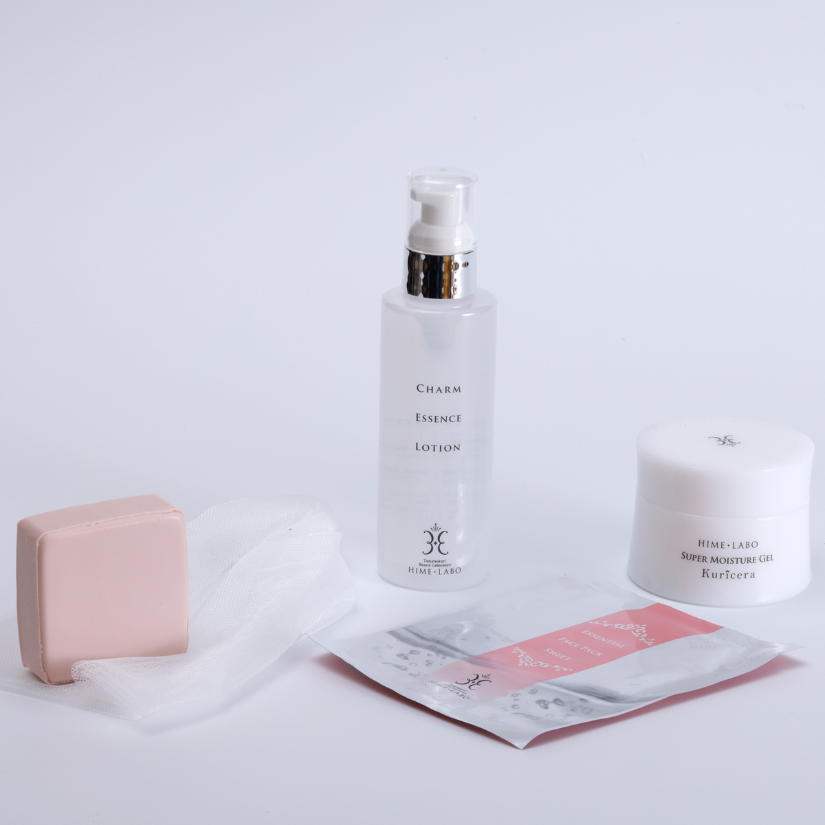 ●数量・内容:姫ラボ石けん80g、エッセンスローション150ml、クリセラ100g、フェイスパックシート17ml、泡立てネット