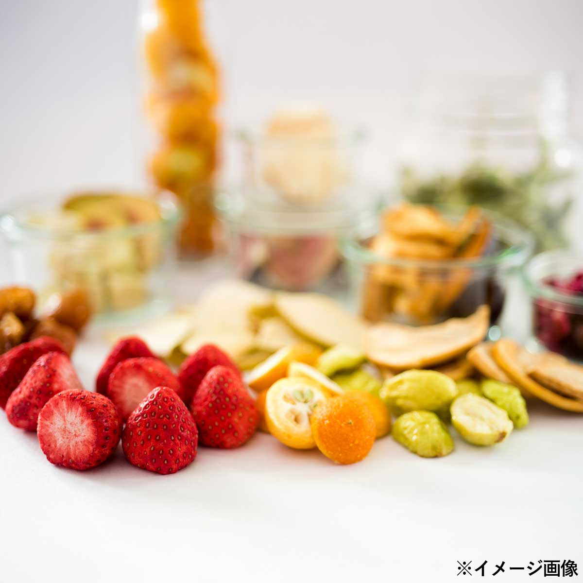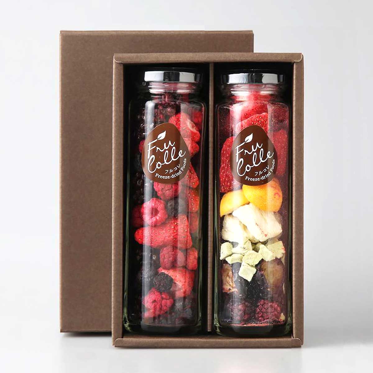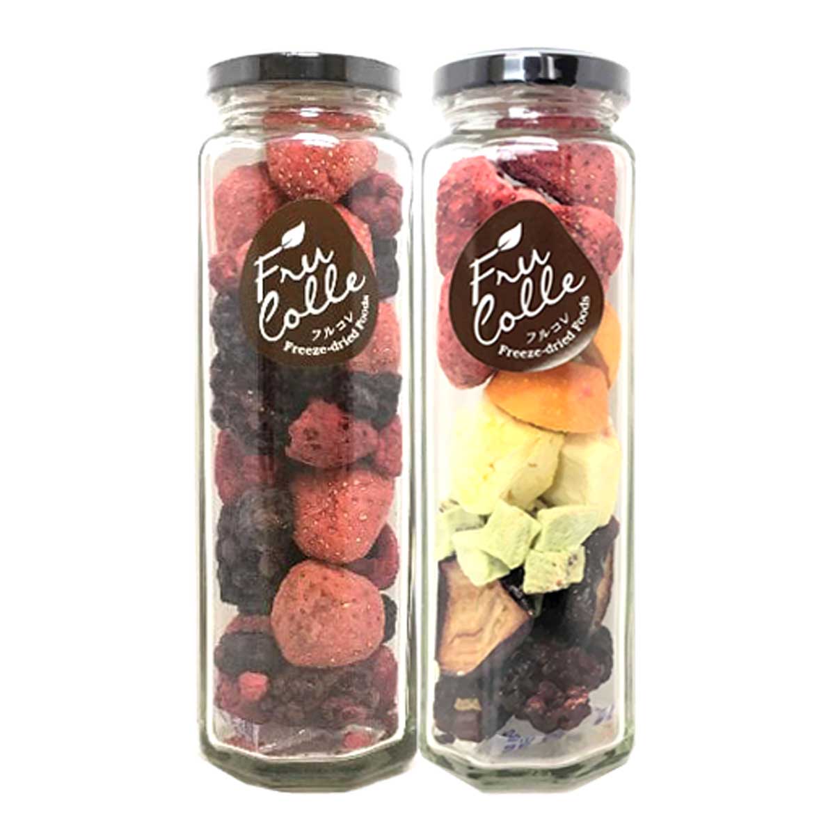 生のフルーツから水分だけを取り除いた「フルコレ フリーズドライ フルーツ」です。お口の中でフレッシュなフルーツの風味がよみがえります。おやつやおつまみなどとしてそのまま召し上がっていただくだけではなく、ヨーグルトやアイスにトッピングしてパフェを作ったり、ワインや炭酸水に入れたりしてもおいしくお召し上がりいただけます。ジューサーで攪拌するとフレッシュジュースに。アイスクリームといっしょにミキサーにかければフルーツアイスになります。常温保存できますので、冷蔵庫に入れる必要がなく、いつでも手軽にフルーツをお召し上がりいただけます。レインボー(ブドウ・キンカン・イチゴ・ブラックベリー・パインアップル・キウイフルーツ)、MIXベリー(イチゴ・ブルーベリー・ラズベリー・ブラックベリー)をセットにしました。おしゃれな八角瓶に入っておりますので、ギフトやプレゼントにもおすすめです。{食べ方}・ヨーグルトやスムージーに・フルーツグラノーラの材料に・紅茶にプラスしてフレーバーティーに・トーストにのせて・ワインに入れてサングリアに