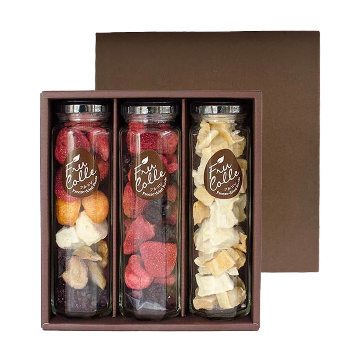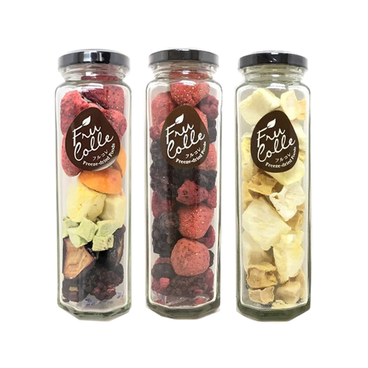 生のフルーツから水分だけを取り除いた「フルコレ フリーズドライ フルーツ」です。お口の中でフレッシュなフルーツの風味がよみがえります。おやつやおつまみなどとしてそのまま召し上がっていただくだけではなく、ヨーグルトやアイスにトッピングしてパフェを作ったり、ワインや炭酸水に入れたりしてもおいしくお召し上がりいただけます。レインボー(ブドウ・キンカン・イチゴ・ブラックベリー・パインアップル・キウイフルーツ)、MIXベリー(イチゴ・ブルーベリー・ラズベリー・ブラックベリー)、パイン/マンゴーのセットです。フルーツの美しい色とかたちをそのままに、フレッシュな香りをおしゃれな八角瓶に封じこめました。華やかな色合いはギフトやプレゼントにもおすすめです。{食べ方}・ヨーグルトやスムージーに・フルーツグラノーラの材料に・紅茶にプラスしてフレーバーティーに・トーストにのせて・ワインに入れてサングリアに