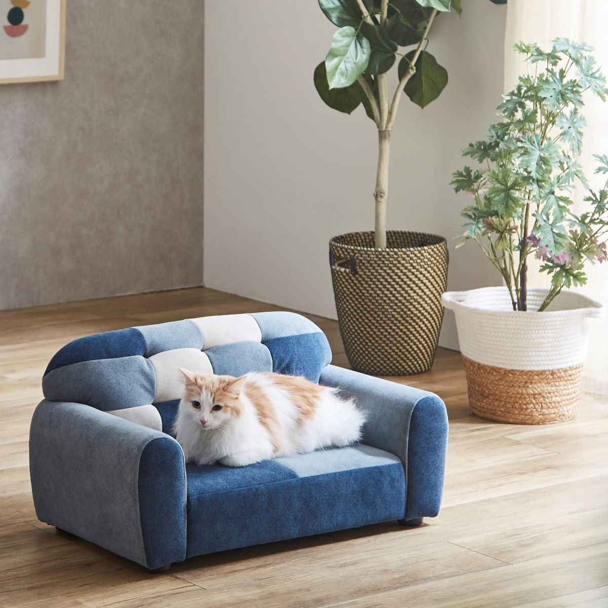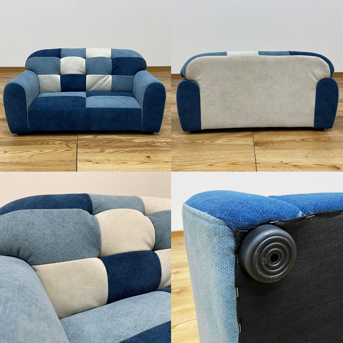 引っ掻きに強い特殊繊維を使用した「大川リビング ペットソファー パンダ」です。汚れに強い撥水加工を施しております。ブルーカラーを基調とした可愛い色合いのパッチワークのデザインで、愛猫、愛犬もきっと満足します。組み立て不要の完成品ですので、届いてすぐにお使いいただけます。