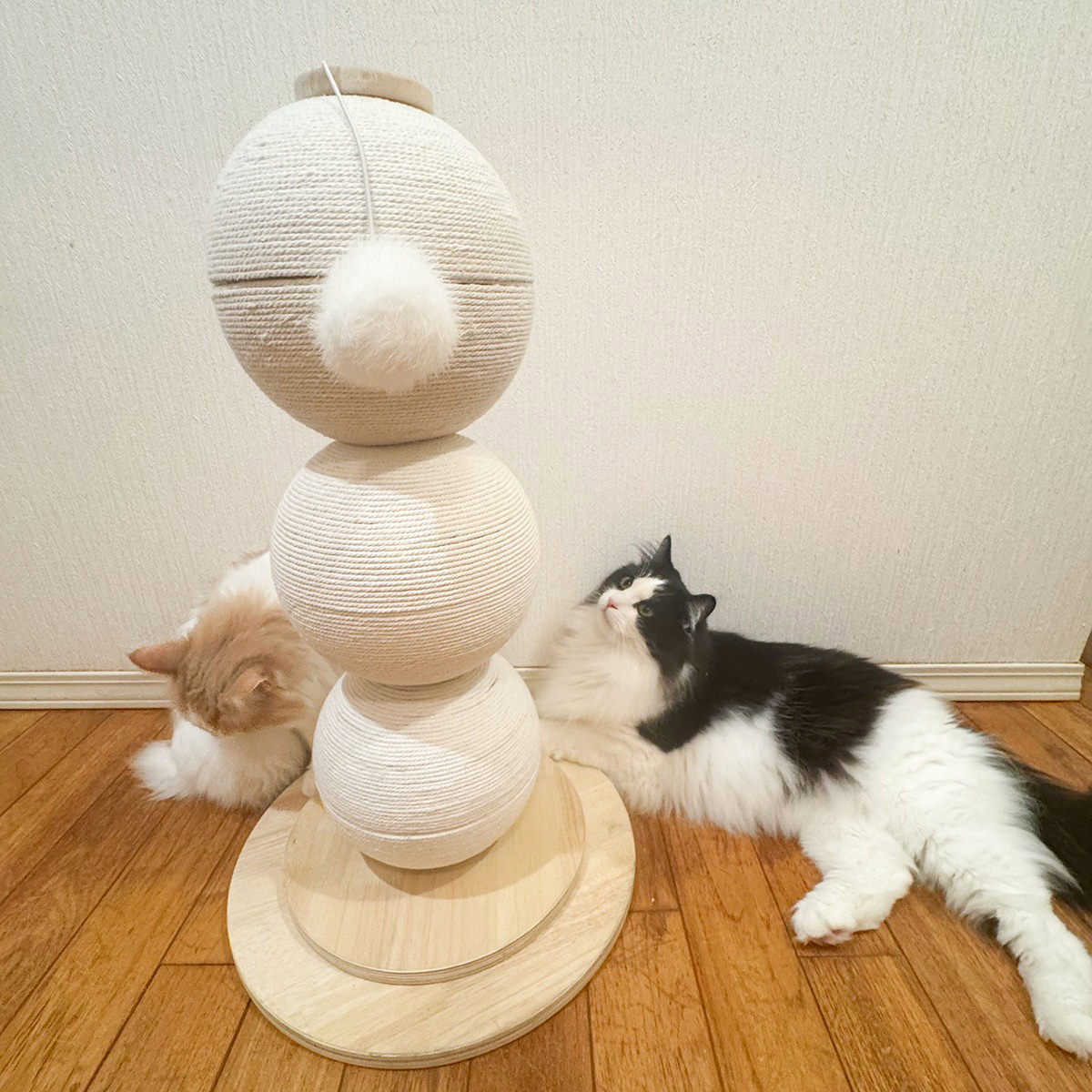 「大川リビング 猫用爪とぎ キャットスクラッチャー」は、愛猫のネイルケアに役立つ、置き型の爪とぎです。まるいお団子のフォルムが可愛い爪とぎで、お部屋のインテリアアイテムとしても活躍します。素材に綿が使われているので、ゴミが出にくく、お部屋が散らかる心配も少ないです。愛猫の爪で劣化した場合、1段、2段、3段目のどこの位置でも変更が可能なため、経済的に使えます。※本品は組み立て式の商品です。