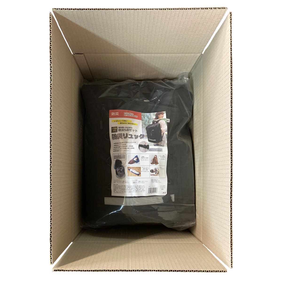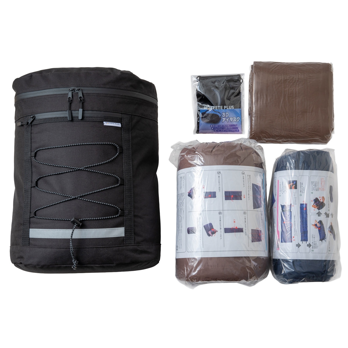 寝具メーカーが考えた”寝るため”のアイテムを搭載した「MOTTETE PLUS 防災リュック 一人用 5点セット」です。インテリアになじみやすいスタイリッシュなデザインなので、見えるところに置いておけばサッと持ち出せます。<リュックサック>大容量30L。カラーはブラック・ネイビー・グレーからお選びいただけます。<寝袋>備長炭の粒子が入った多機能わたを採用。収納袋に入れるとクッション、広げれば掛布団として使えます。洗濯機で丸洗いが可能です。<エアーマット>ノズルをまわすだけで空気が入る自動膨張式。枕部分は手動です。側地には防水加工が施されています。収納袋付き。<毛布>燃え広がりにくい「難燃ポリエステル糸」を使用した敷・掛兼用のフリース毛布です。日本防炎協会認定を取得。洗濯機で丸洗いが可能。<アイマスク>3D立体構造になっており、目元の圧迫が少なく、軽量で快適な着け心地です。