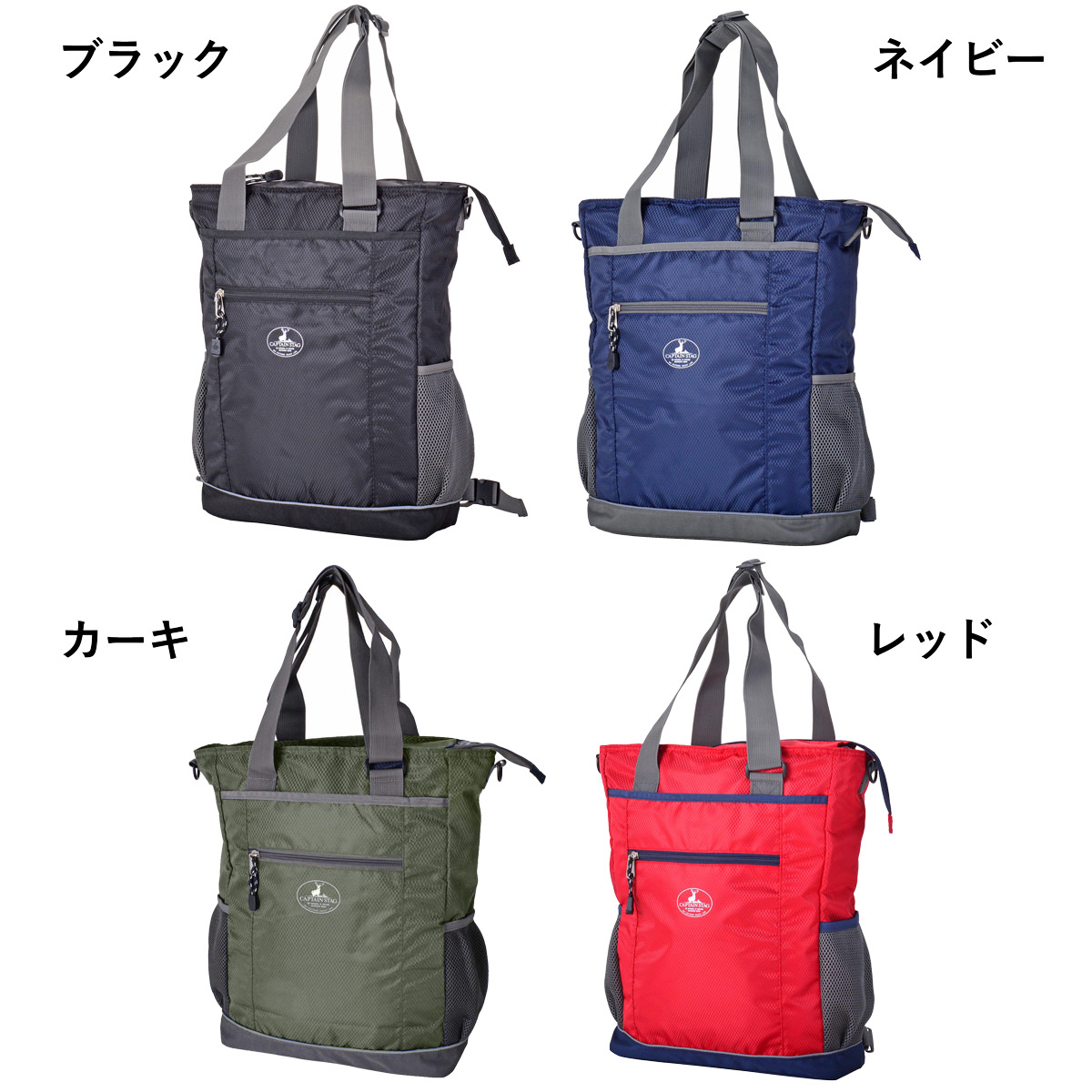 「CAPTAIN STAG 3WAY トートバッグ」は、手持ち・肩掛け・リュックの3通りの使い方ができる、容量約20Lのトートバッグです。メインスペースにA4ファイルが楽々入るタテ型形状です。ファスナーポケット、メッシュポケット、ベルクロ付きオープンポケットなどが装備されており、収納スペースも充実。ハンドル(約45~83cm)は肩に掛ける長さにも調整できます。肩掛けに便利なショルダーベルト(約85~141cm)は取り外しも可能です。男女問わずお使いいただけるデザインです。デイリーユースをはじめ、アウトドア、スポーツ、旅行など、さまざまなシーンでご活用いただけます。カラーはブラック、ネイビー、カーキ、レッドからお選びいただけます。