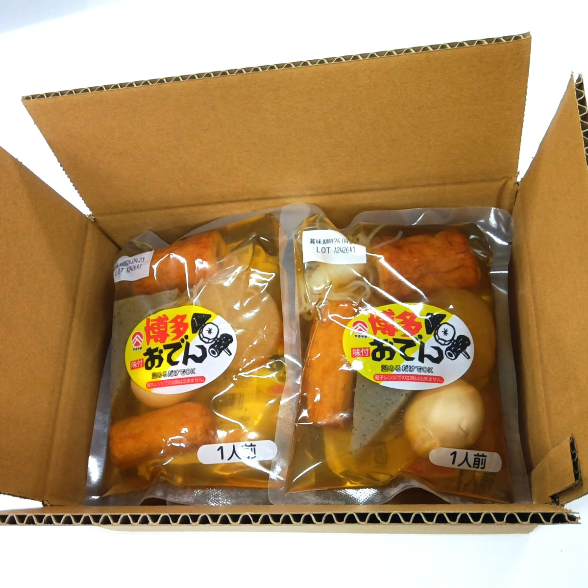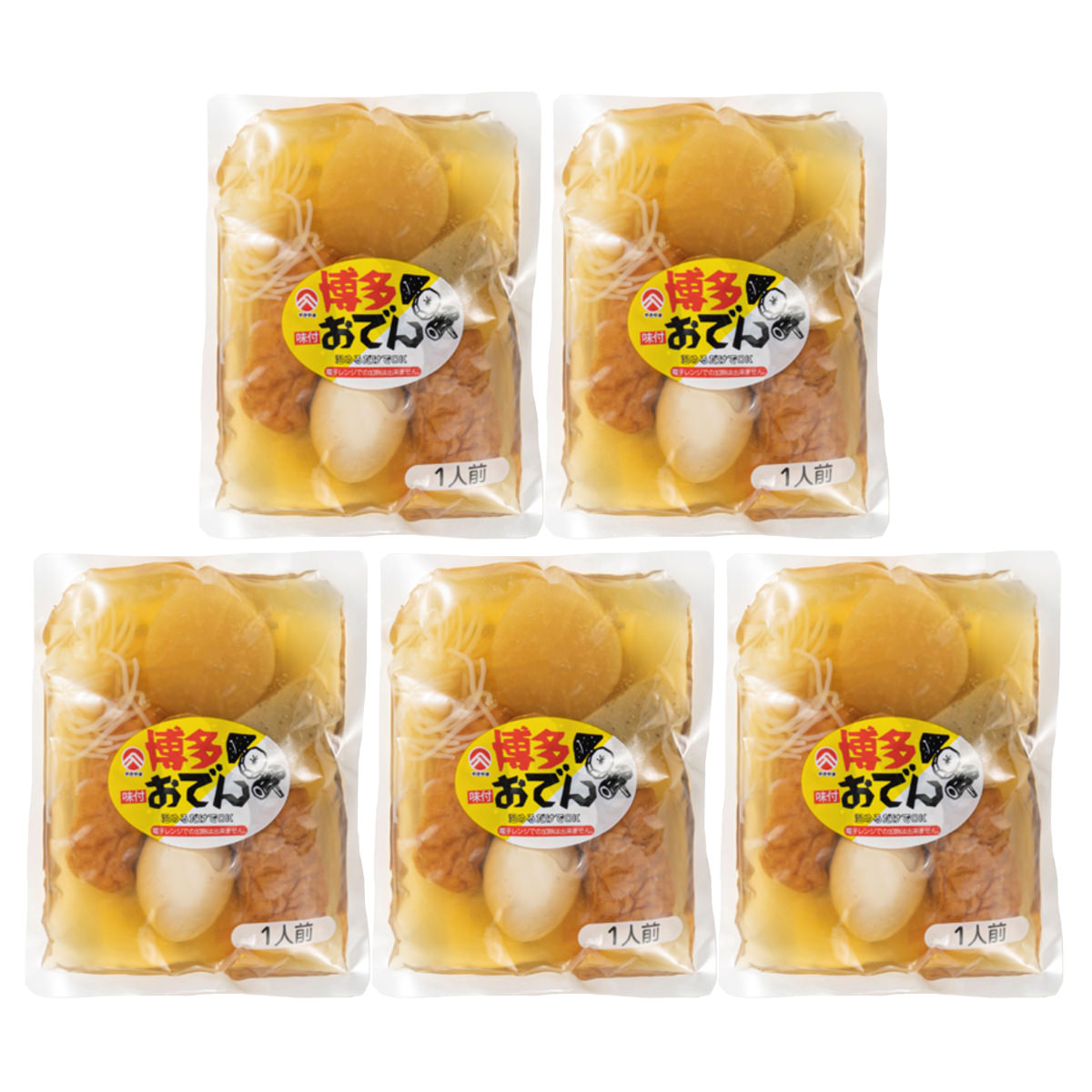 「やきやま 博多おでん 小袋」は、かつおベースにあごだしを加えたスープが特徴の、個食サイズのレトルトおでんです。1960年の創業以来、変わらぬ味。やきやまで人気の6種類(三角こんにゃく、結びこんにゃく、鶏卵、大根、ごぼう天、ちくわ)が入った一人前の個包装です。調理済みですので、温めるだけで美味しくお召し上がりいただけます。お酒のおつまみ、食卓の一品などとして、博多のご当地おでんをお取り寄せでお楽しみください。玉子が破裂する危険性がありますので、電子レンジでの加熱はご遠慮ください。{温め方}<湯せん>袋を開封せず、そのまま沸騰しているお湯の中で約5分間温めてください。<鍋調理>具材とスープを鍋に入れて、約4分間温めてください。
