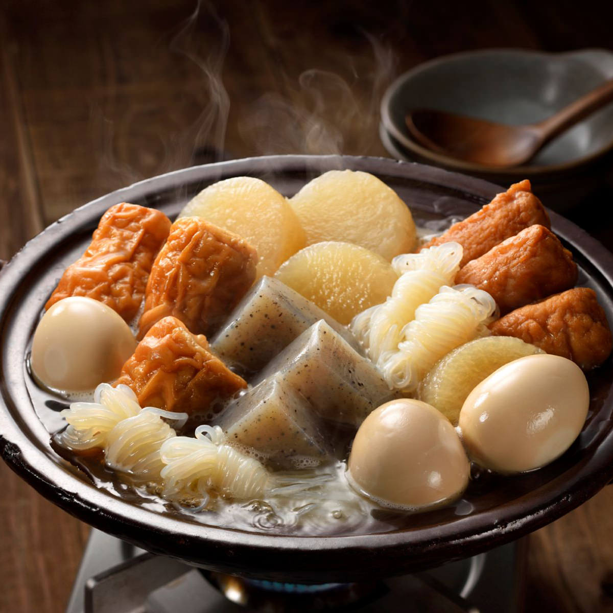 ●原材料:こんにゃく(国内製造、中国製造)、鶏卵、大根、ごぼう天、ちくわ、砂糖、食塩、しょうゆ、たん白加水分解物、醸造酢、かつおぶし、魚醤(魚介類)、あご、あじ、かつおエキス/調味料(アミノ酸等)、水酸化Ca(こんにゃく用凝固剤)、甘味料(ステビア)、pH調整剤、加工でん粉、キシロース、貝殻焼成Ca、(一部に卵・小麦・大豆・魚醤(魚介類)を含む)