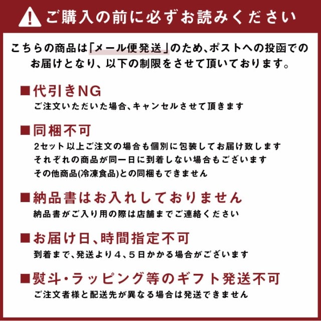 【配送について】メール便でお届けいたします。到着後は直射日光、高温多湿を避け、常温で保存してください。