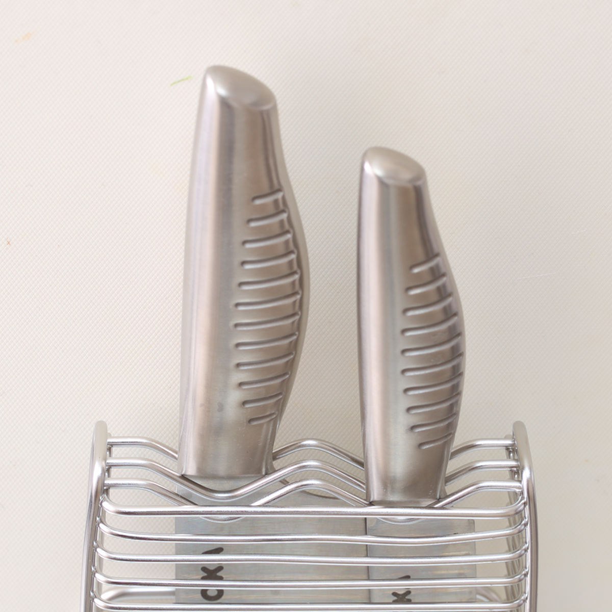 包丁スタンドには、柄元から先端までの長さが約18cm以内の包丁を2本収納できます。ウェーブ形状で、包丁を安定して立てられます。