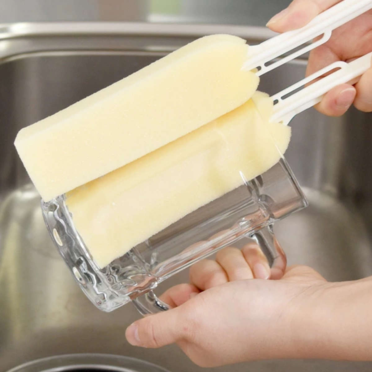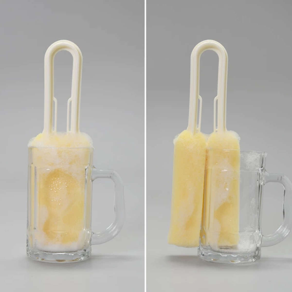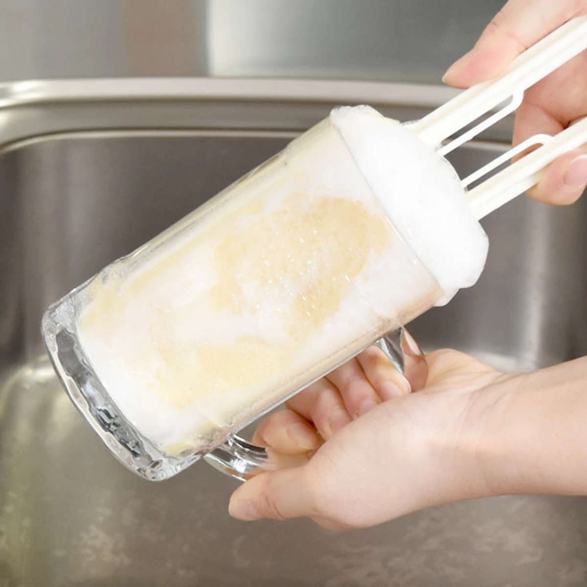 長い柄が付いているので、手が届きにくい深いコップや大きなジョッキの底までしっかり洗えます。スポンジでコップをはさんで回すだけで内側と外側を同時に洗えるため、洗い物の手間がぐっと減ります。