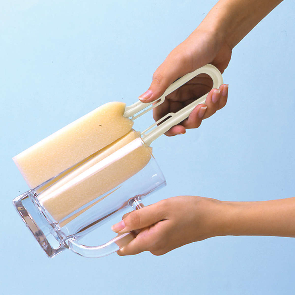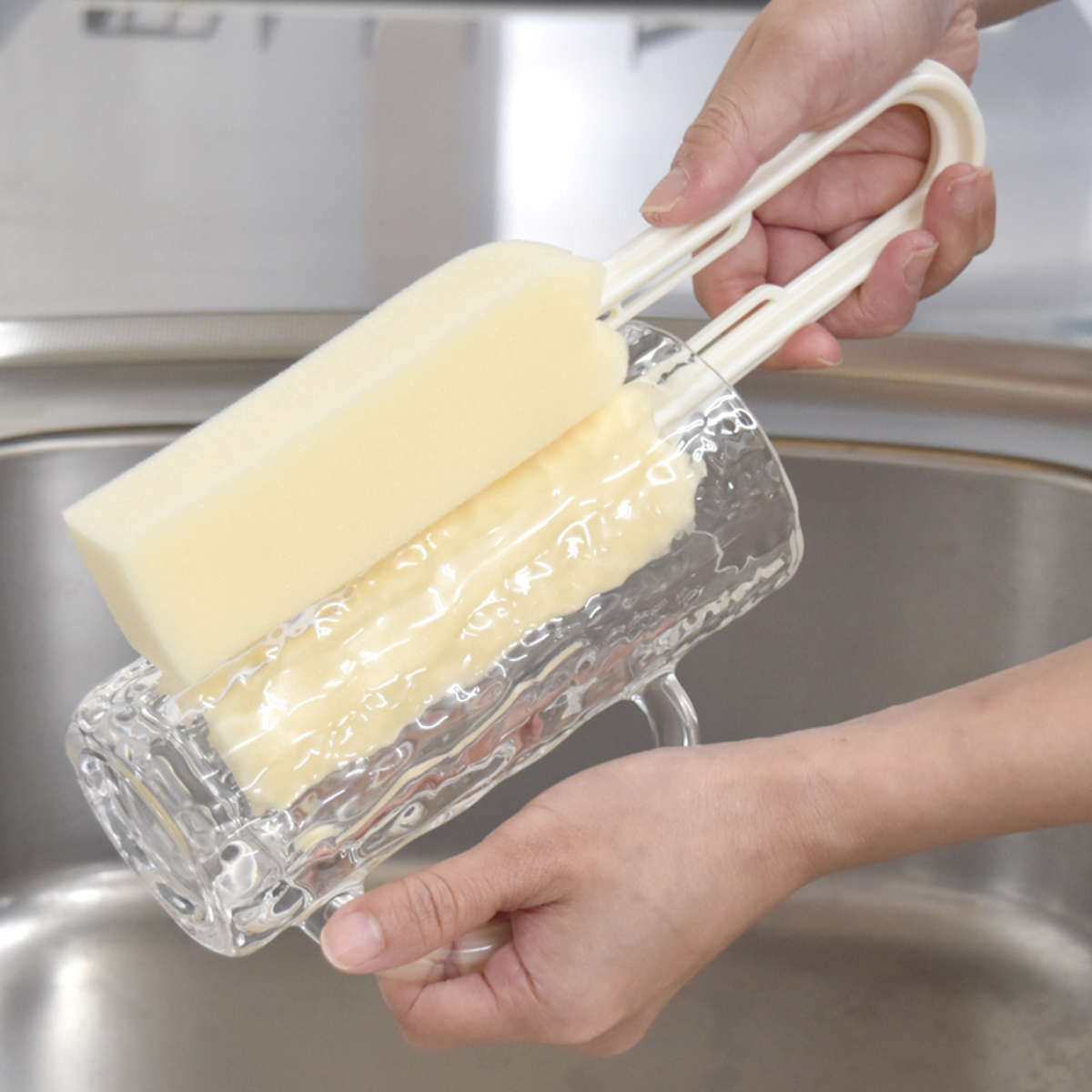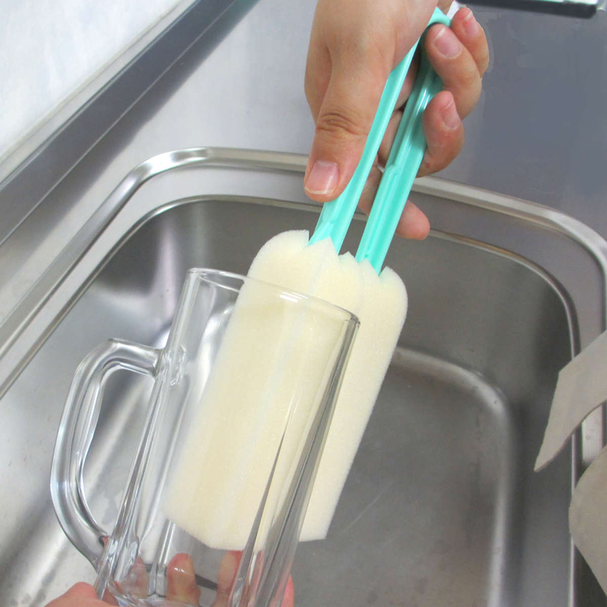 長い柄が付いているので、手が届きにくい深いコップや大きなジョッキの底までしっかり洗えます。スポンジでコップをはさんで回すだけで内側と外側を同時に洗えるため、洗い物の手間がぐっと減ります。