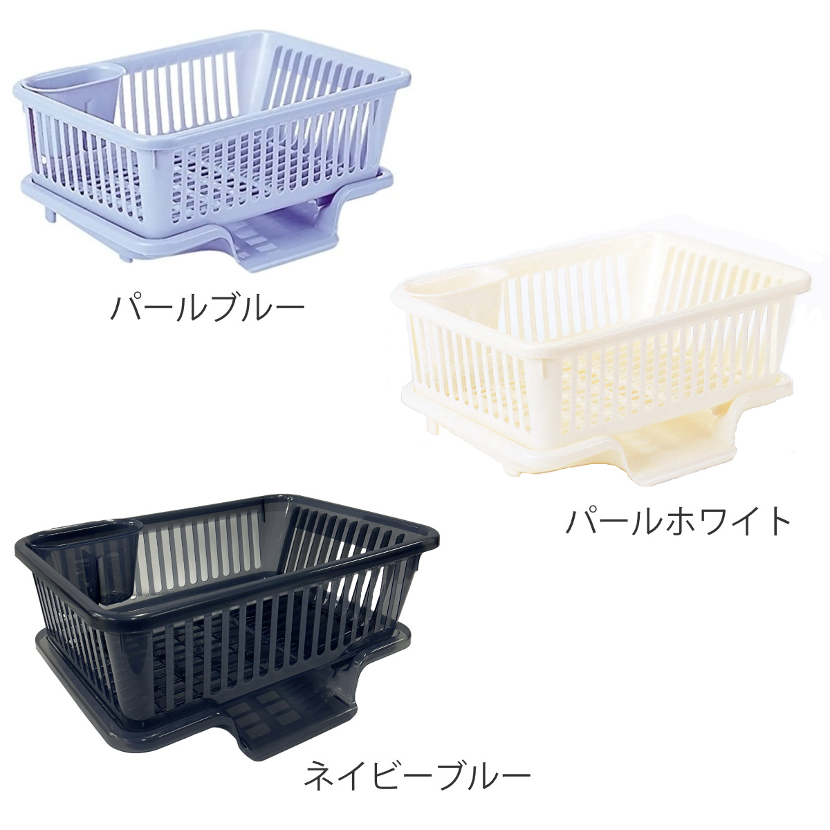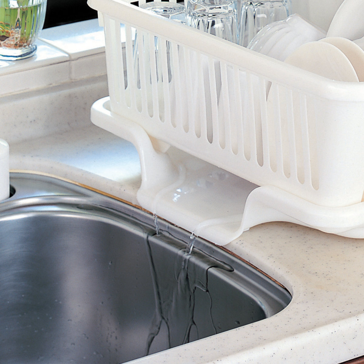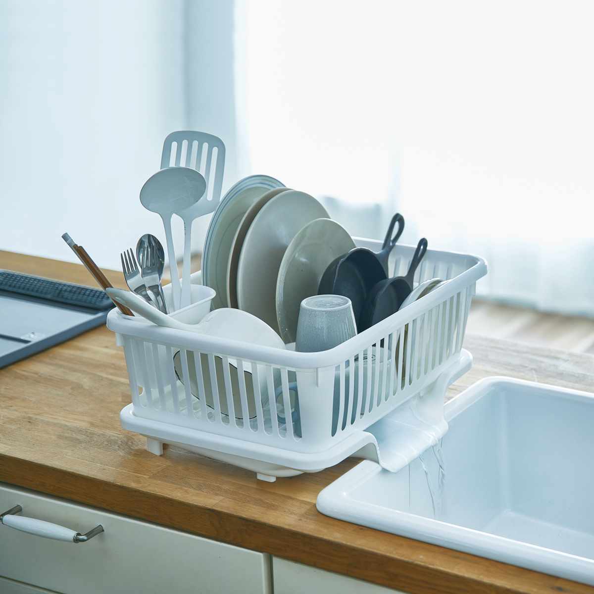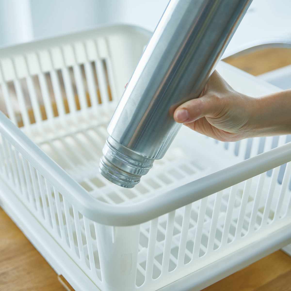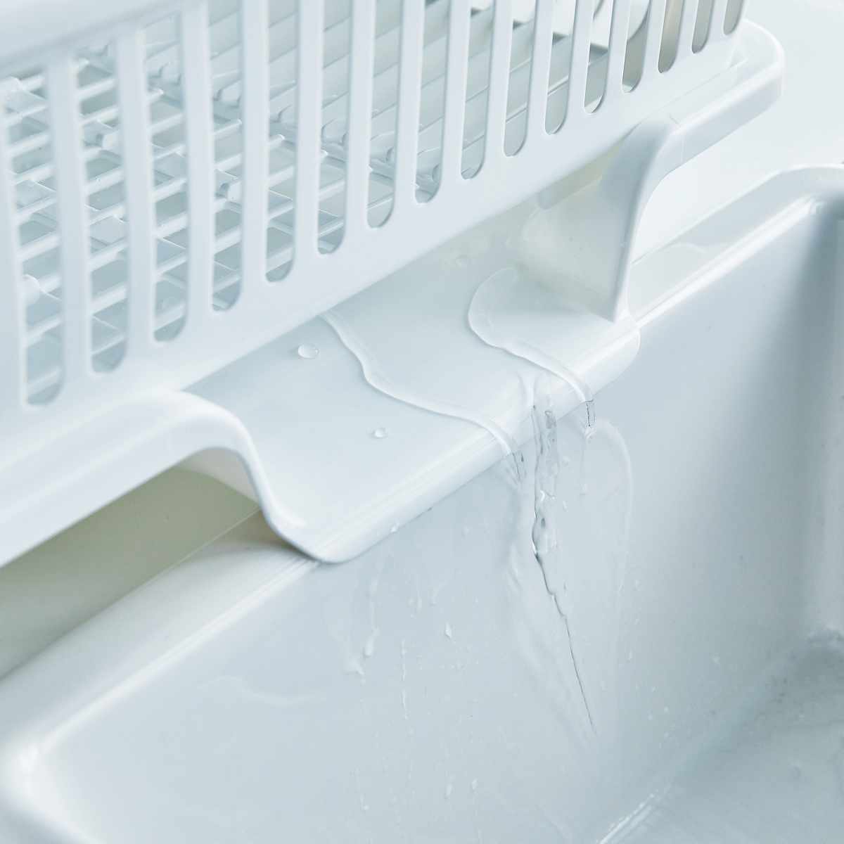 水受けの水が直接シンクに流れ込む構造で、食器を洗うたびに水を捨てる手間が省ける便利な水切りかごです。水はけ抜群で、水アカ・ヌメリがつきにくく、衛生的にお使いいただけます。