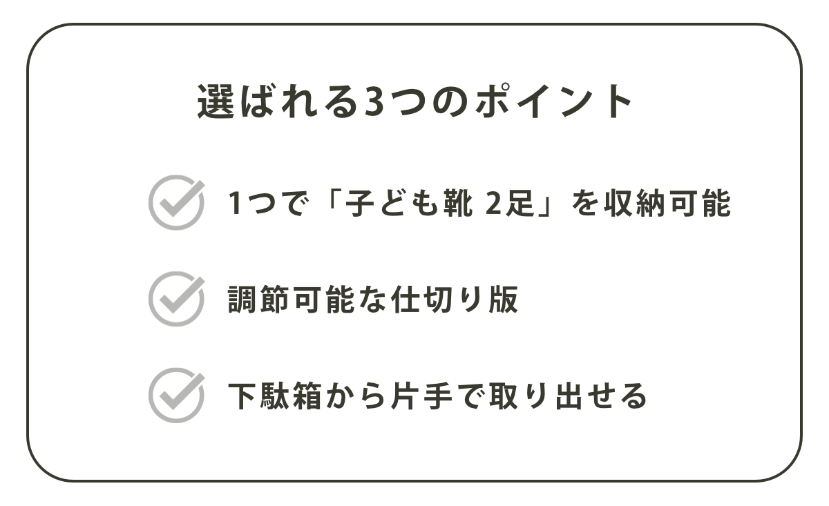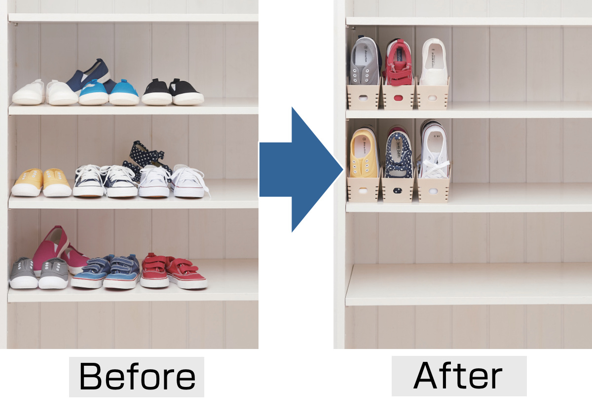 仕切り板がスライド式で靴のサイズに合わせて調整可能です。大きさの違う靴も一緒にバランス良く入れることができるので、ご兄弟のいるご家族にもピッタリです。