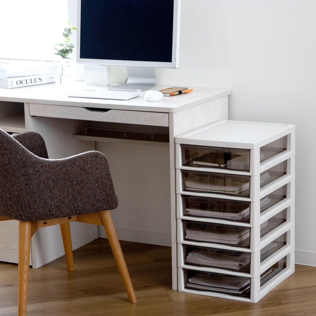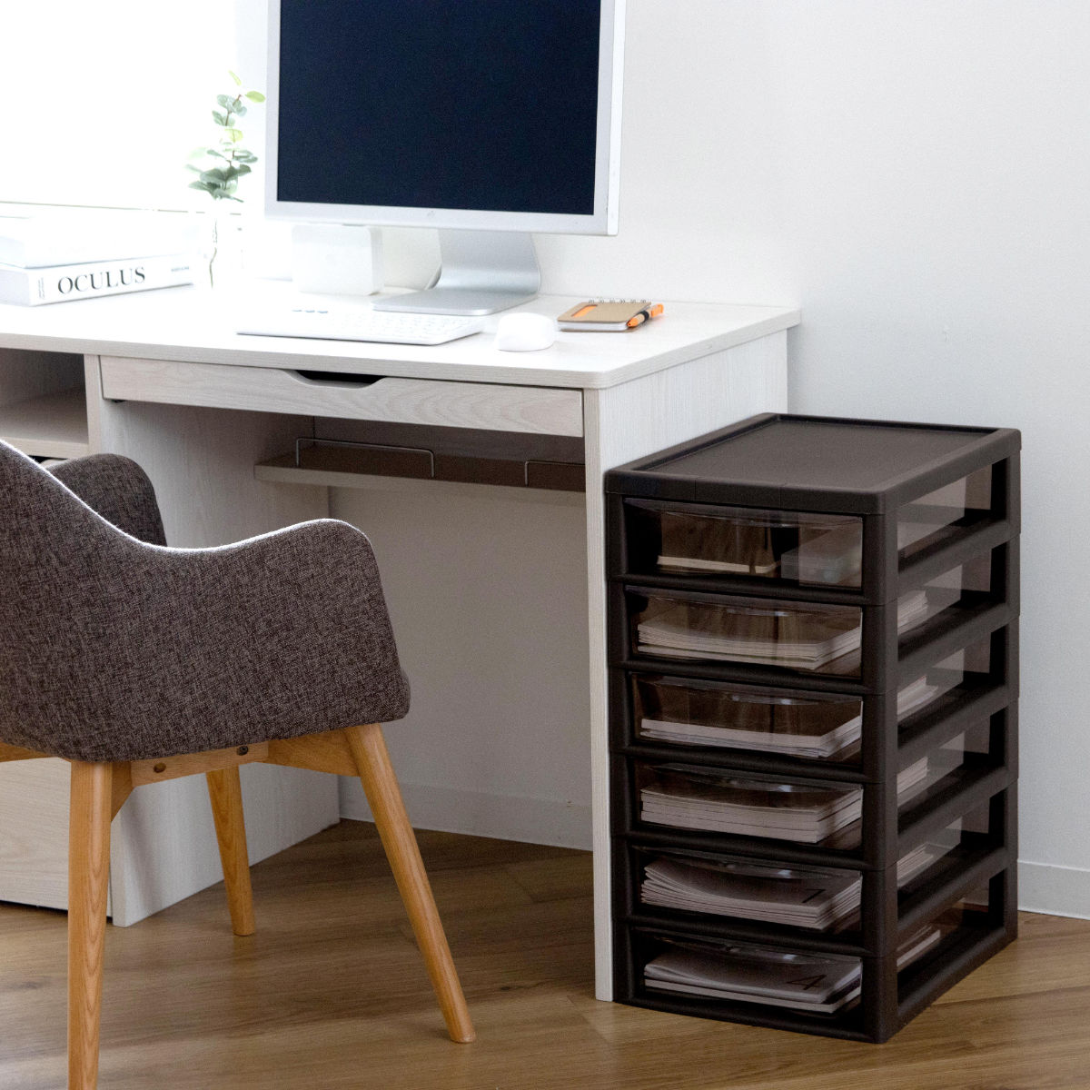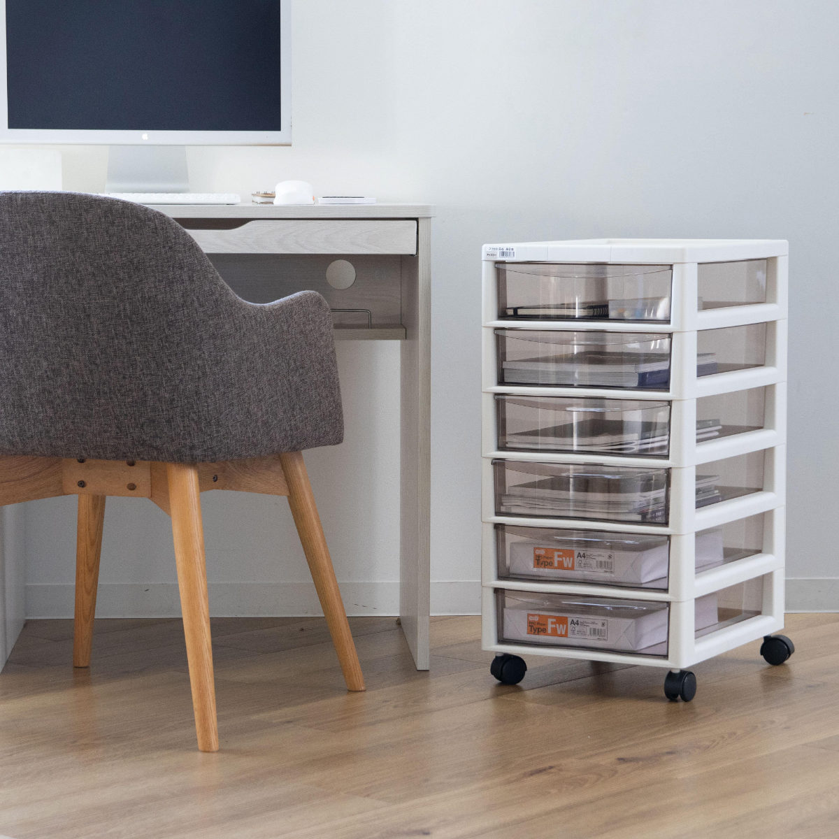 引き出しはB4サイズの深型で、書類やファイルの収納に便利なサイズです。引き出しやすい取っ手付きで開けやすく、ストッパーが付いているので、引き出し過ぎて抜けてしまう心配がありません。外したい時は、強く引くか、引き出しの側面を少し内側にたまわせることで簡単に外すことができます。クリアブラウンカラーで透けて見えるので、引出しを開けなくても中身が確認しやすくなっています。